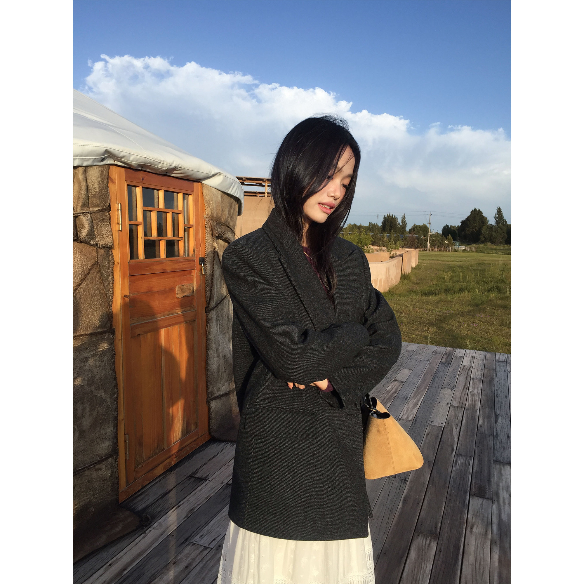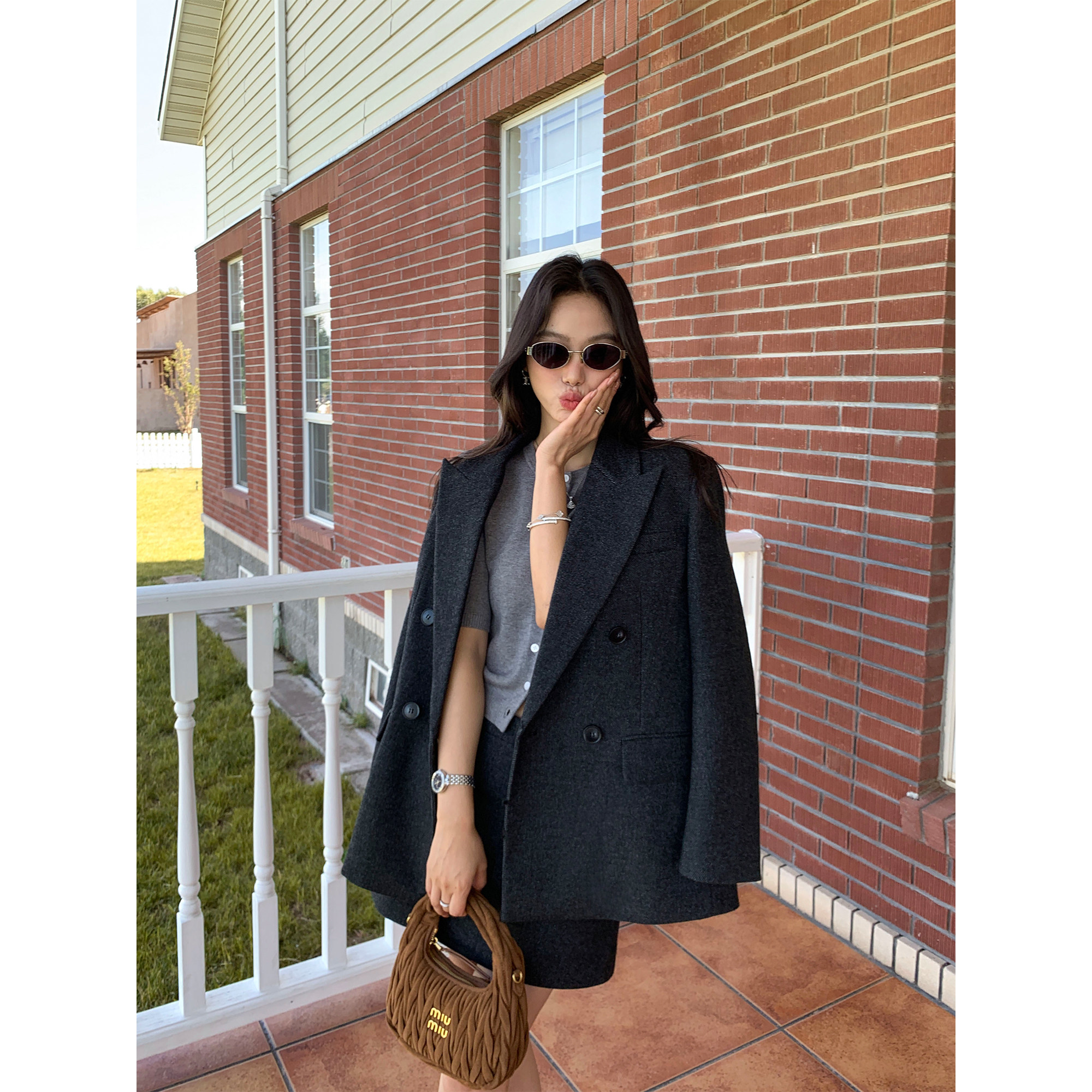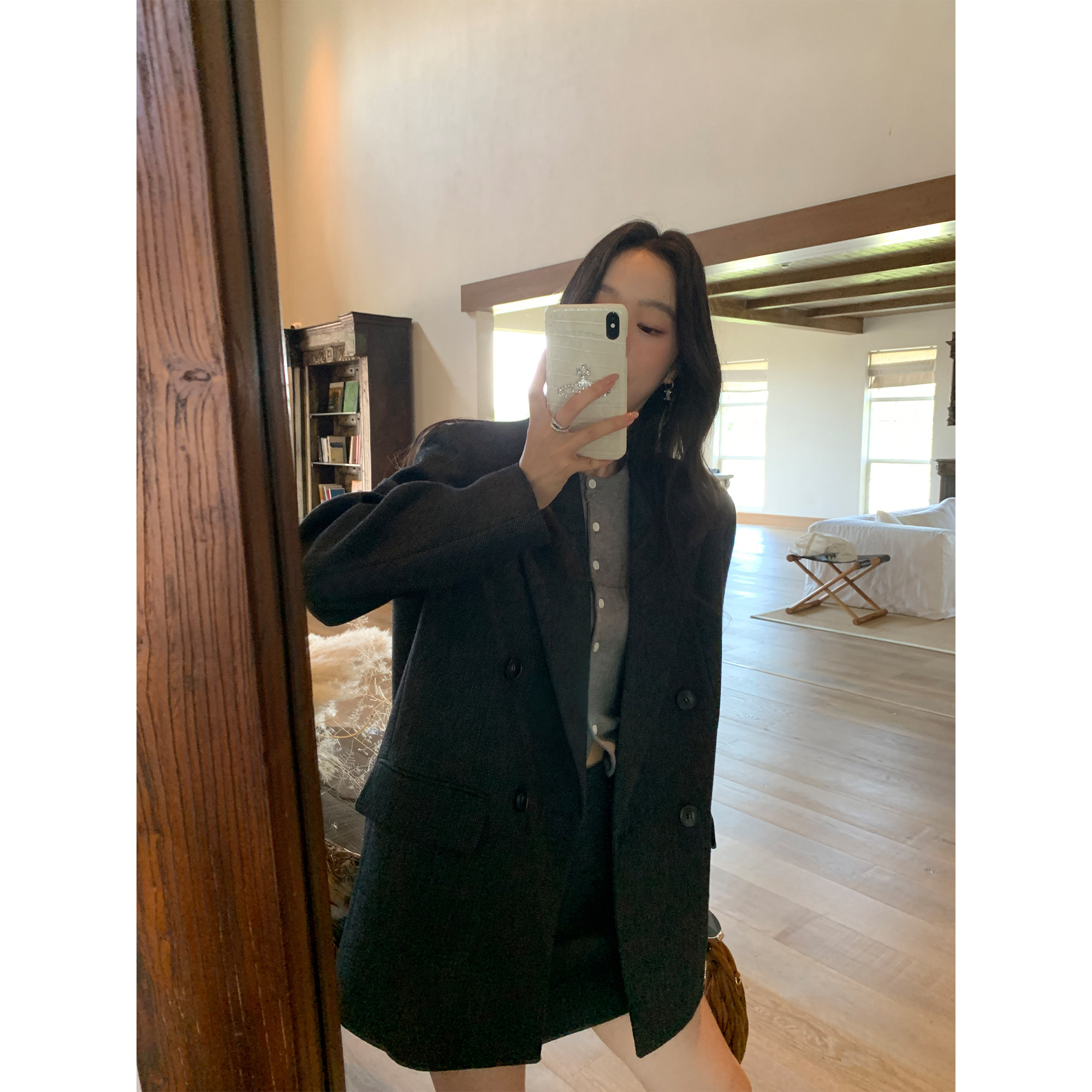 pusumede北欧假期西装 外套女双排扣高阶质感西服毛呢半身裙两件套