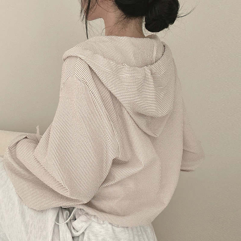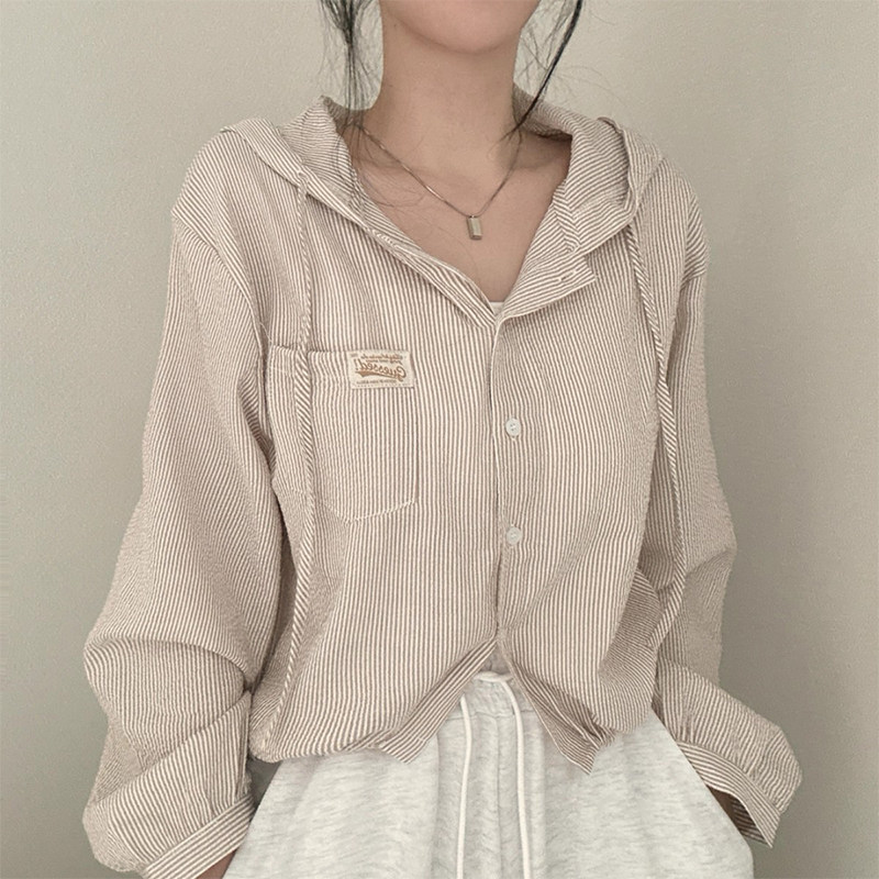 衬衫 韩国chic春季 条纹连帽式 复古气质字母贴布口袋长袖 外套女 新款