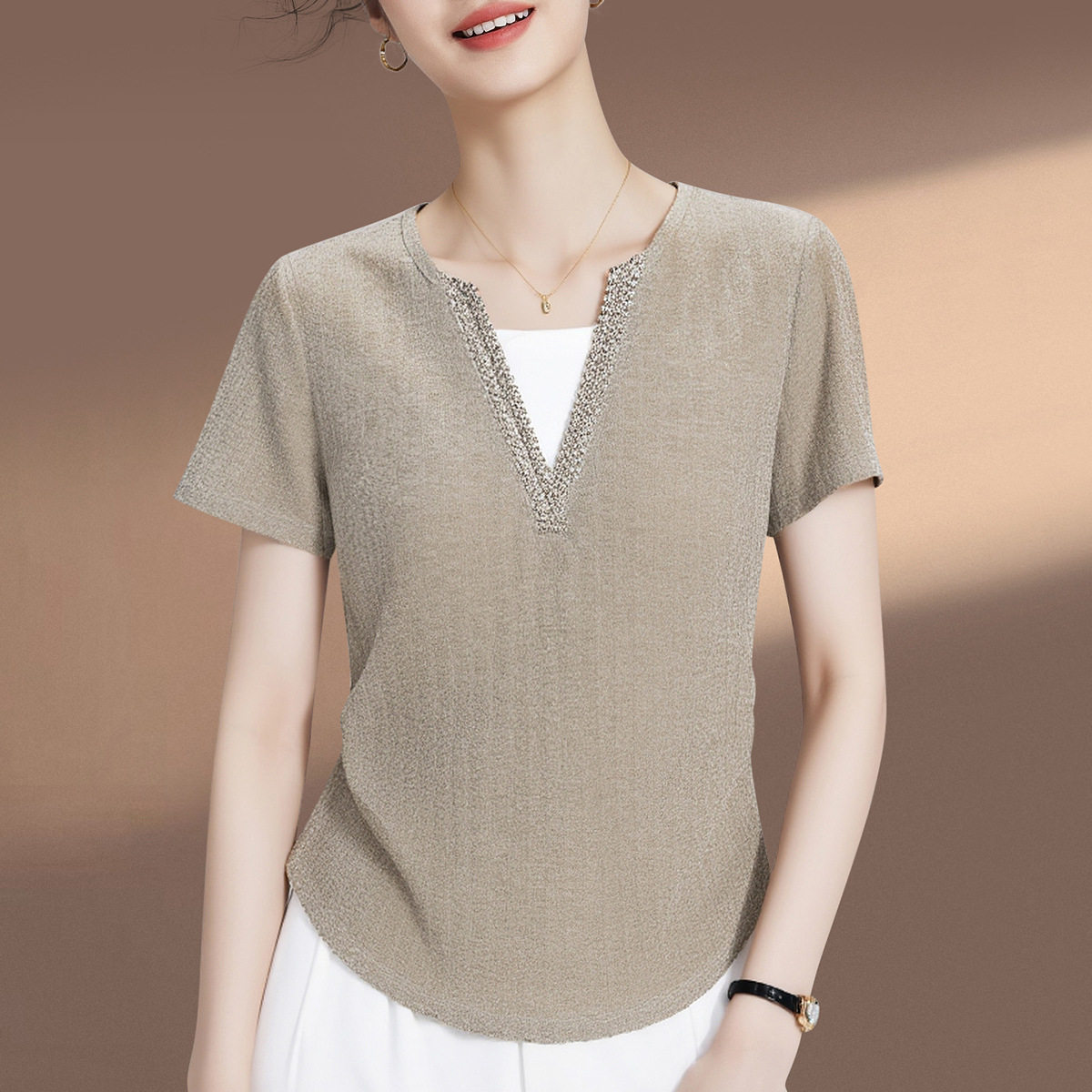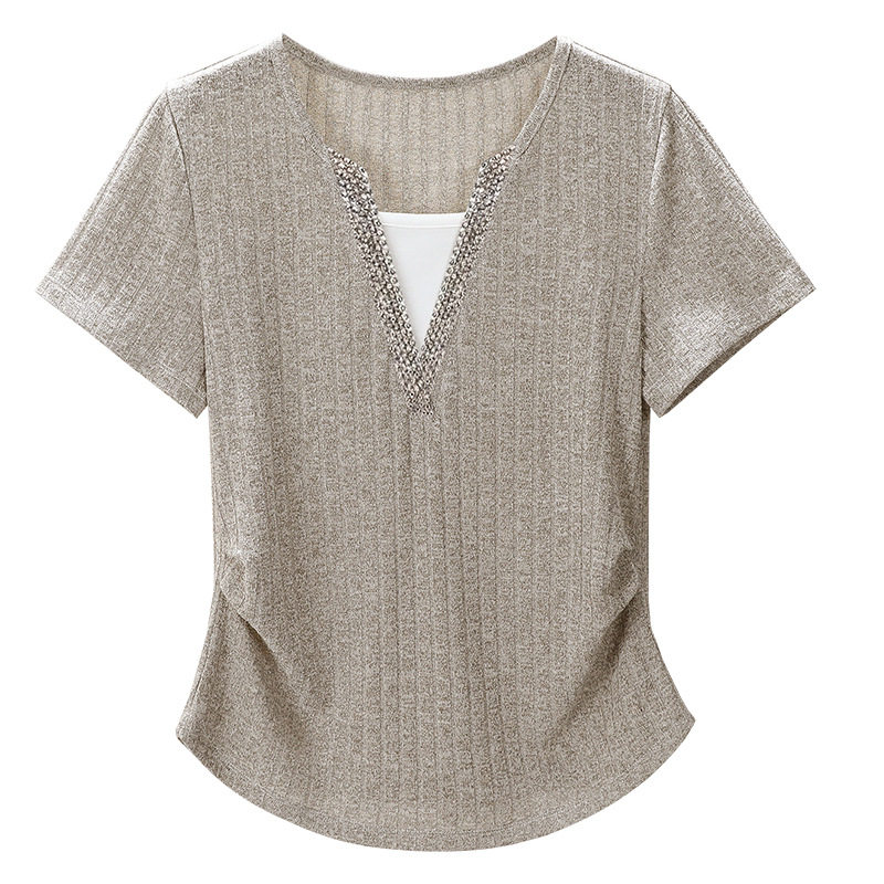 女装 大码 收腰遮肚显瘦上衣 T恤女2026夏季 假两件t烫钻V领正肩短袖