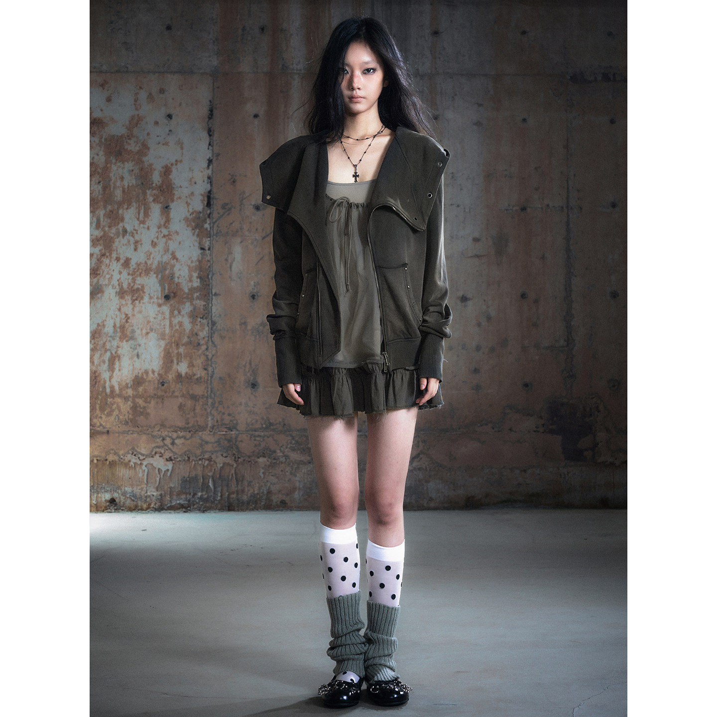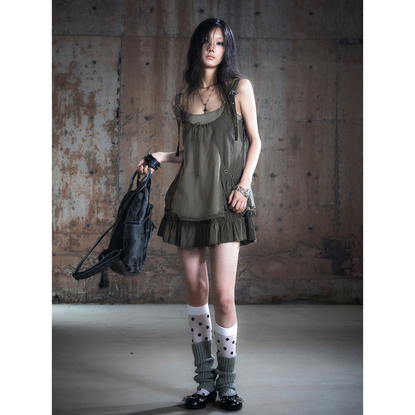 CestNous真两件网纱拼接吊带裙女秋季 百搭毛边抽绳系肩带连衣裙