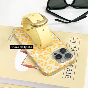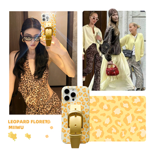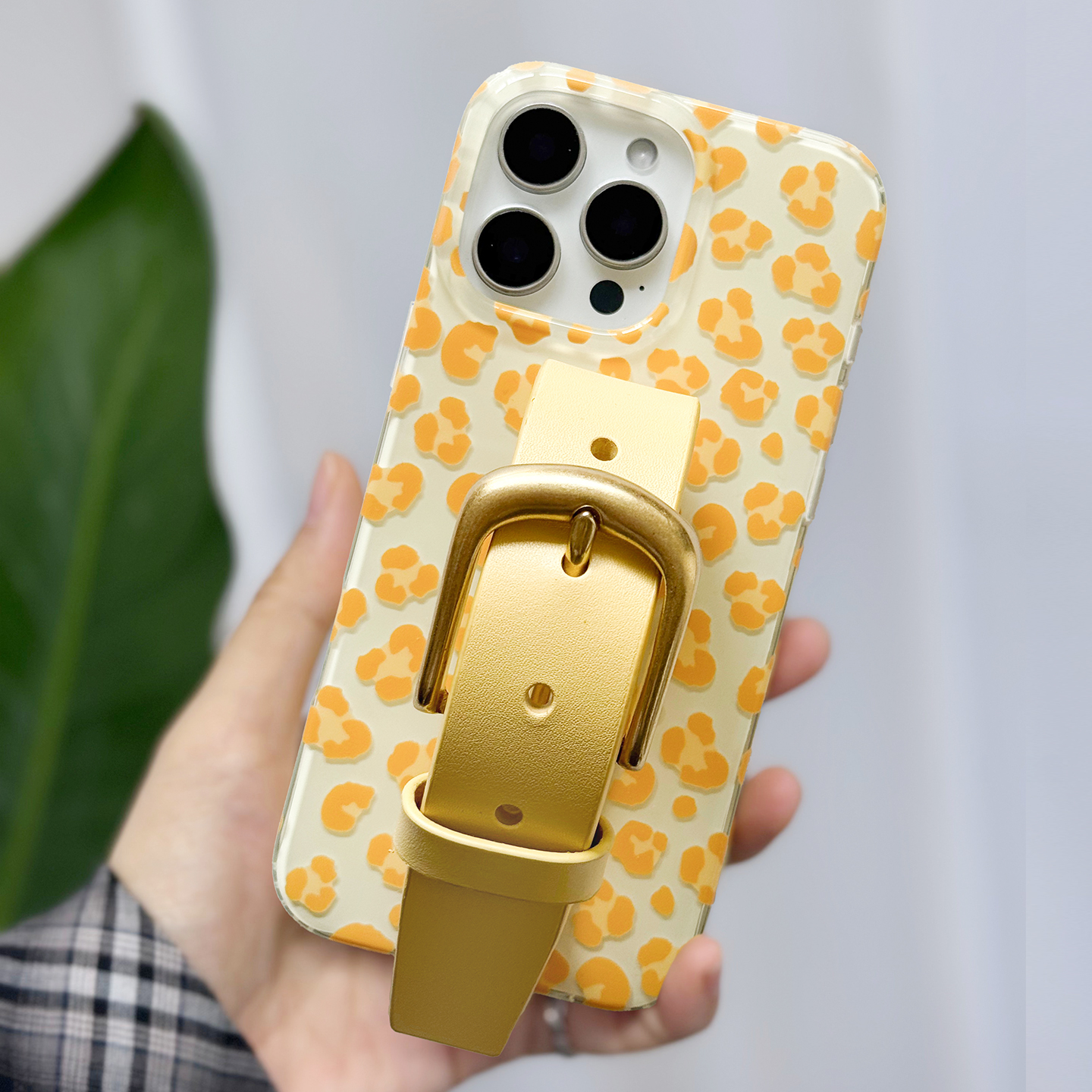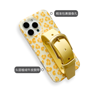 小鸡黄豹纹印花经典 手机壳便携手机保护套适用于苹果17promax 牛皮腕带款 15系列复古小众防摔保护壳 款