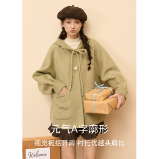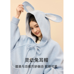 新款 紫涵双面呢大衣女2025年冬季 兔耳连帽毛呢外套 美利奴羊毛