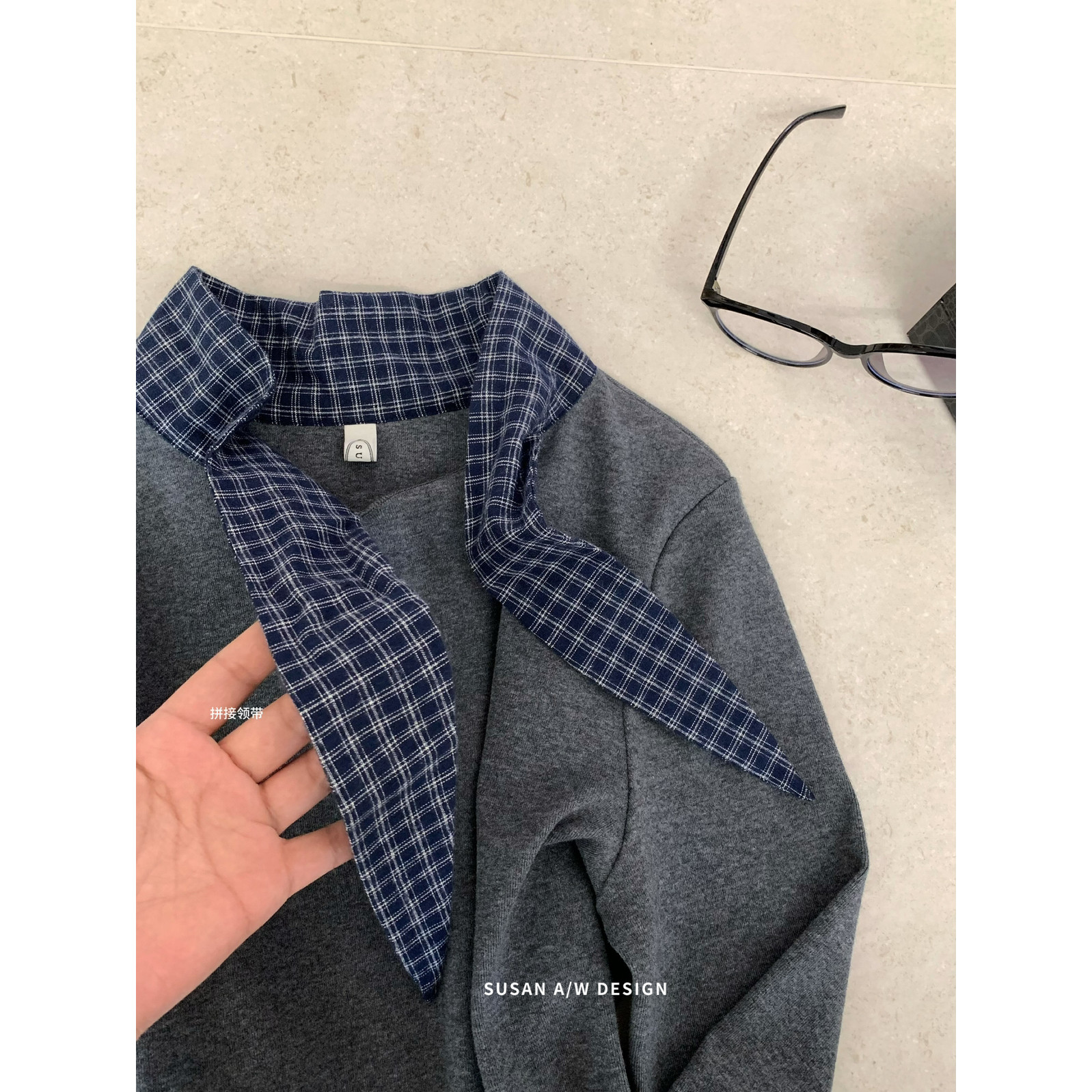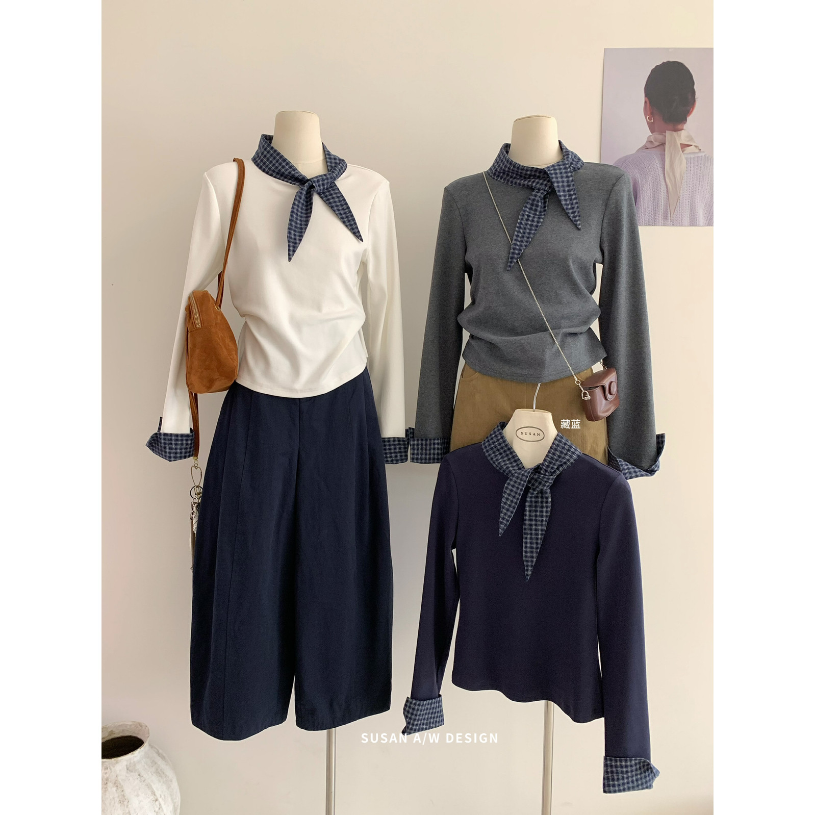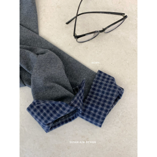 T恤女DW6250 长袖 SUSAN 十三行春夏韩系ins甜美减龄打结格子领修身