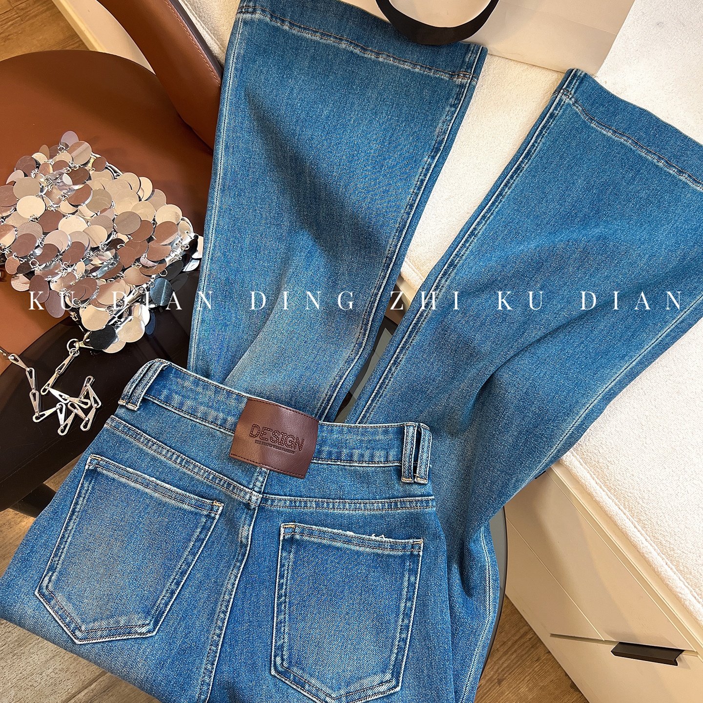 洗水猫爪纹微喇牛仔裤 common 复古重工低腰黑灰渐变裤 0120 女