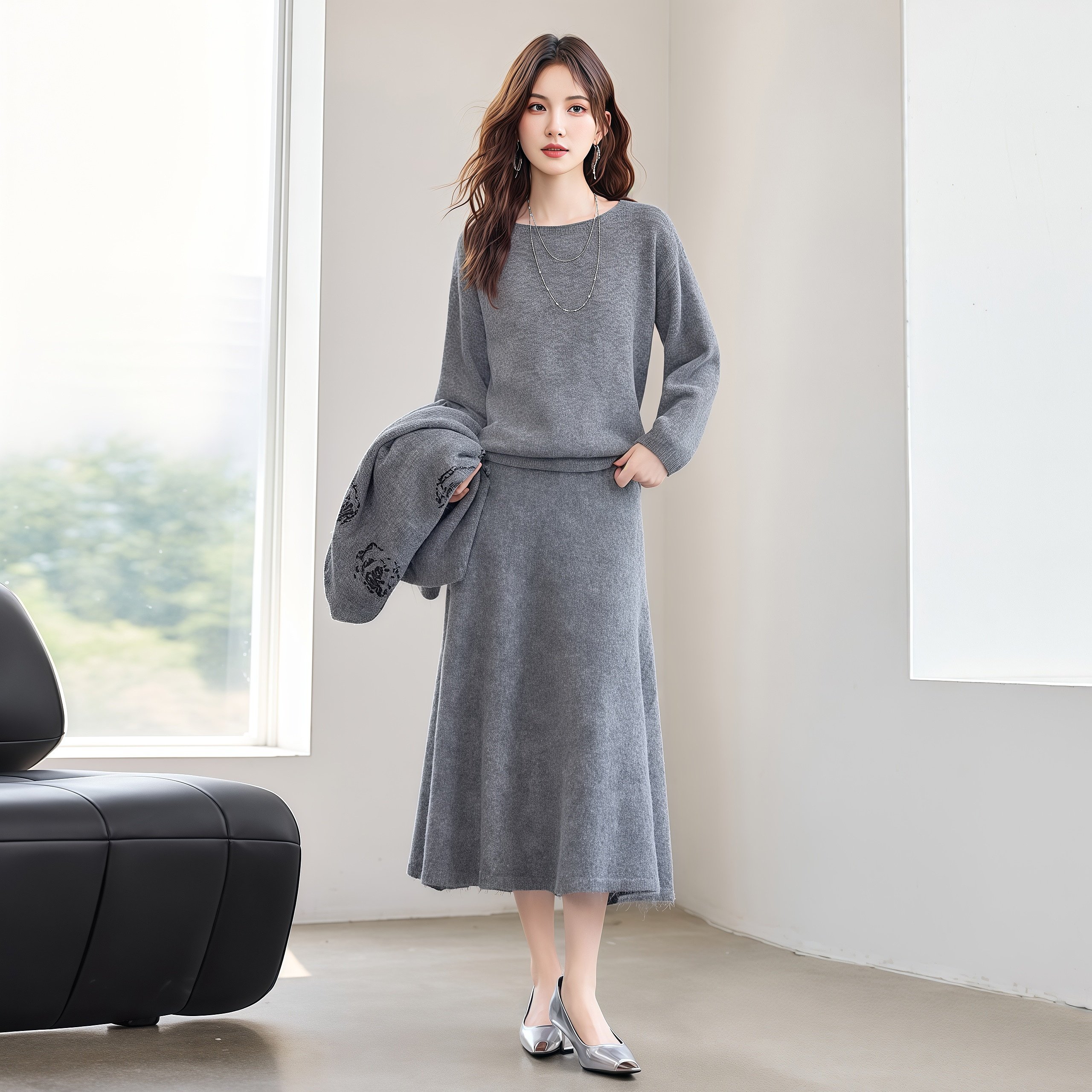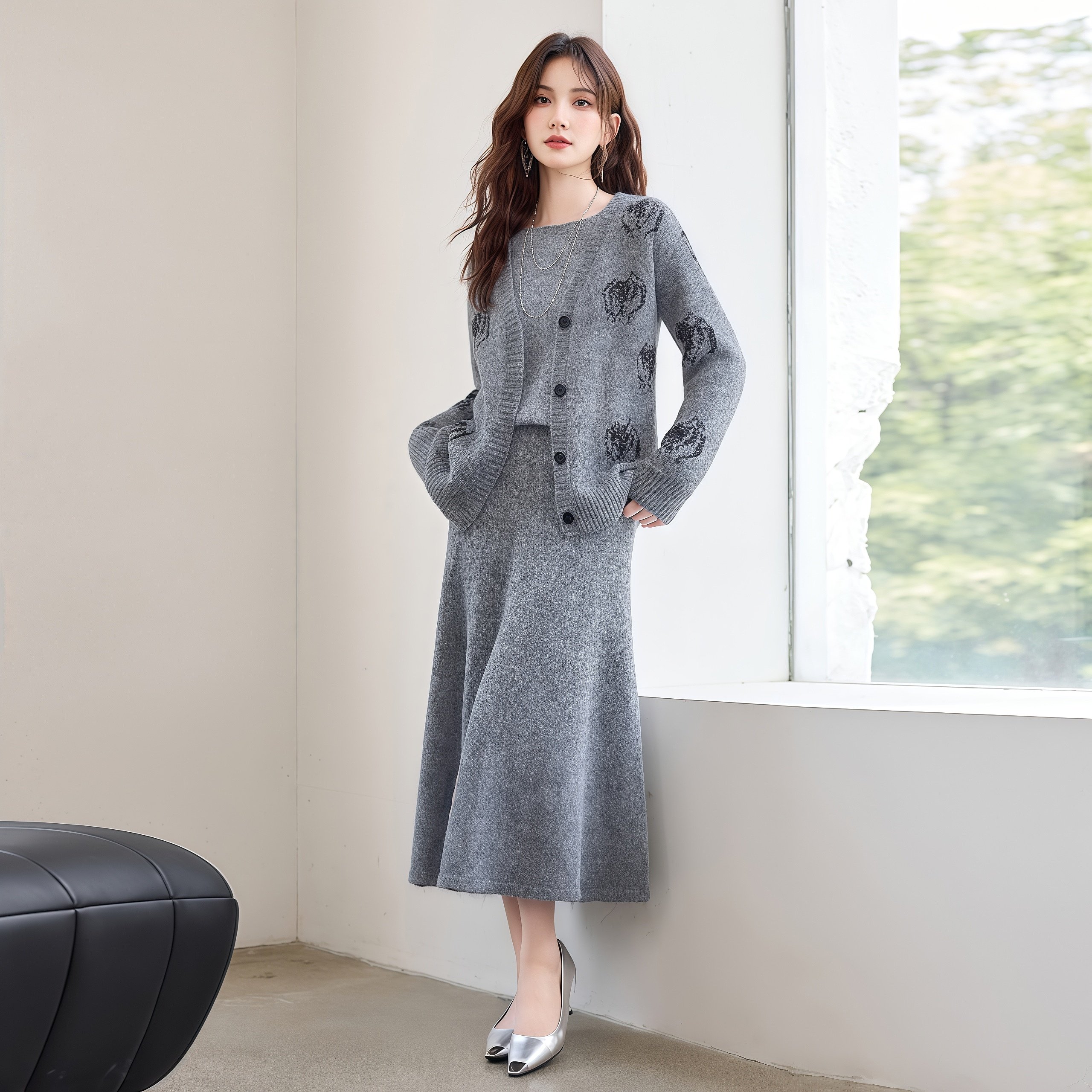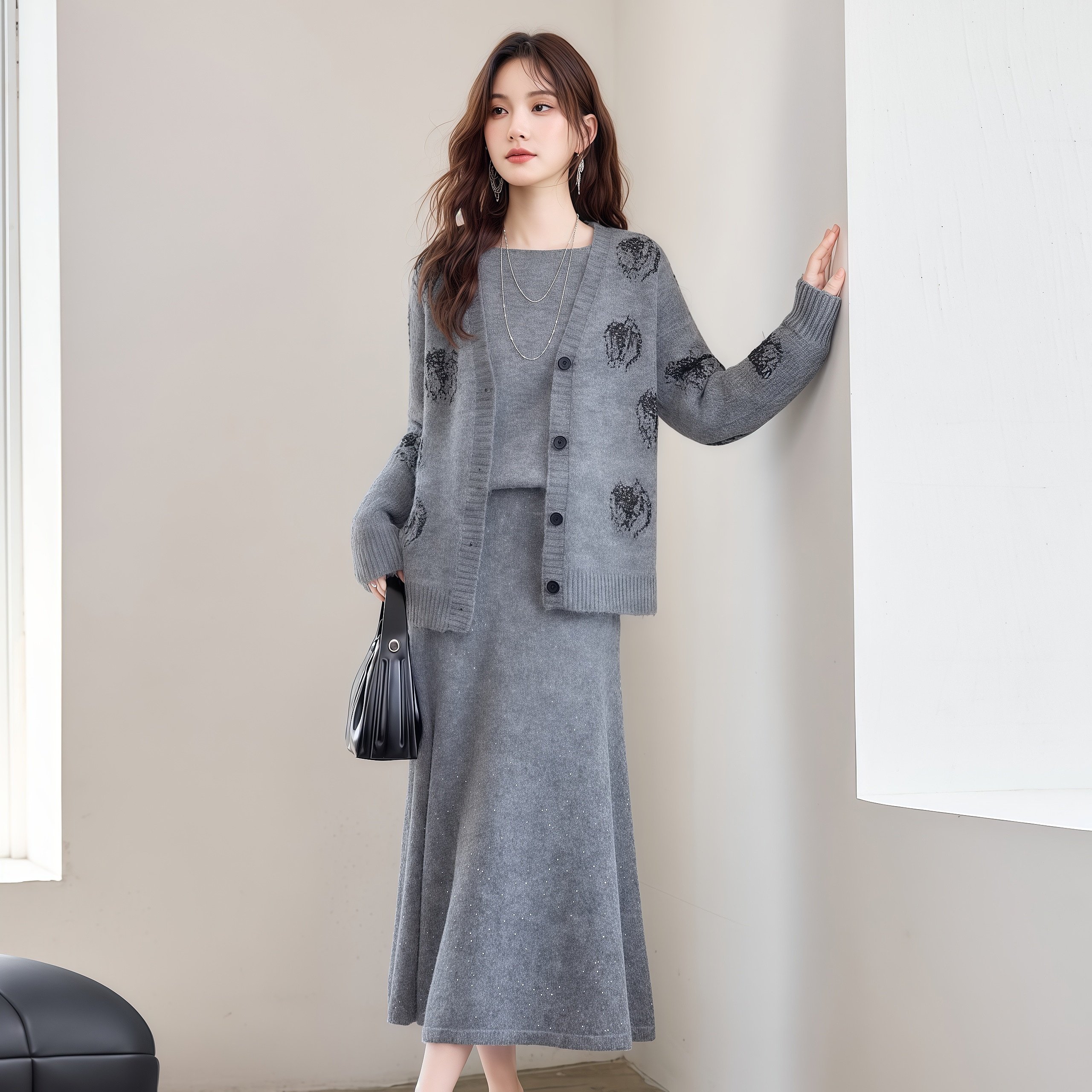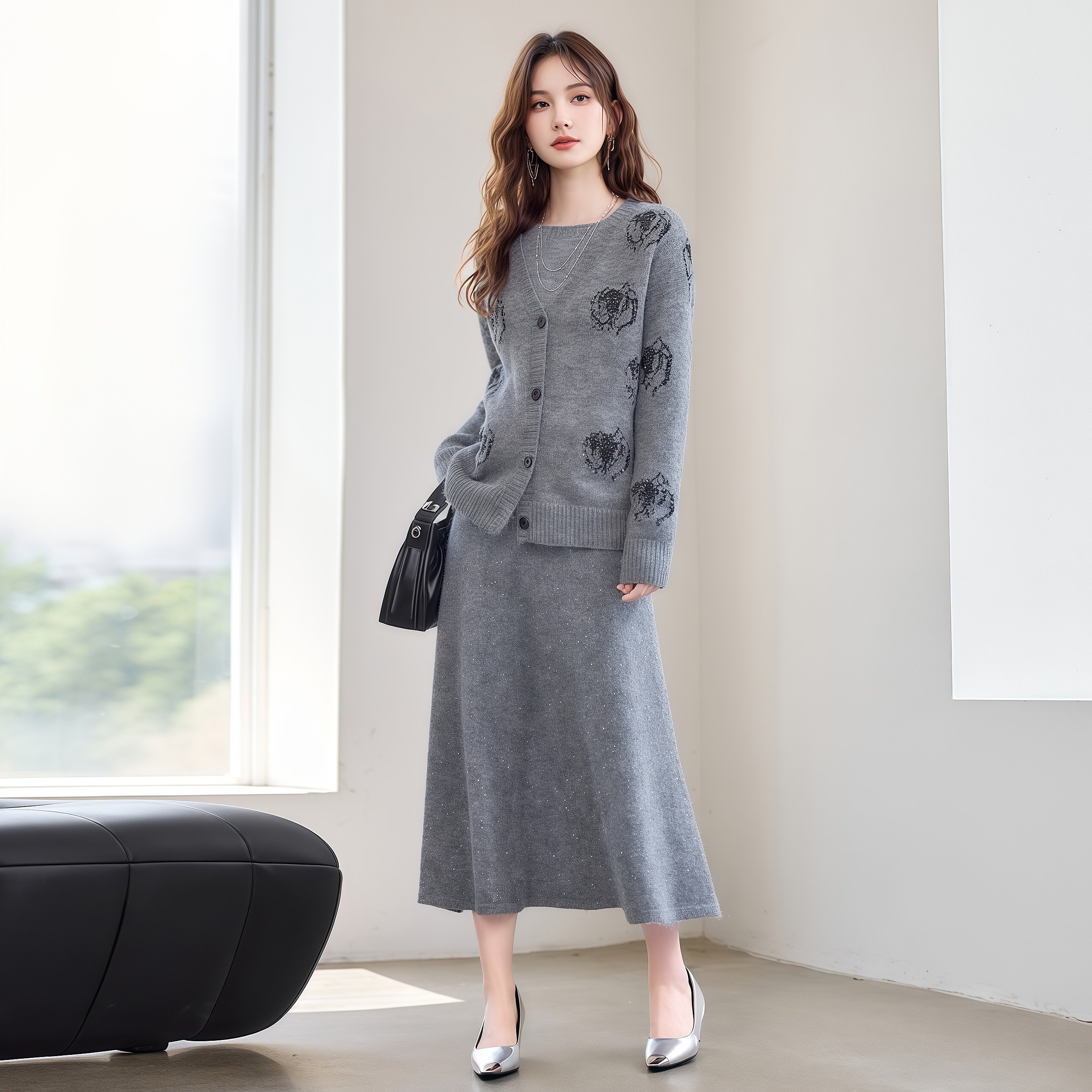 时尚 半身裙三件套 重工灰色针织套裙女小个子气质圆领亮片温柔开衫