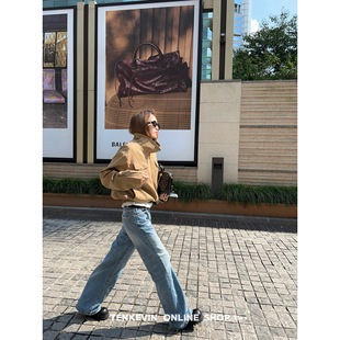 乔栈加绒咖色不贴腿微喇牛仔裤 女秋冬高腰显瘦设计感小个子阔腿裤