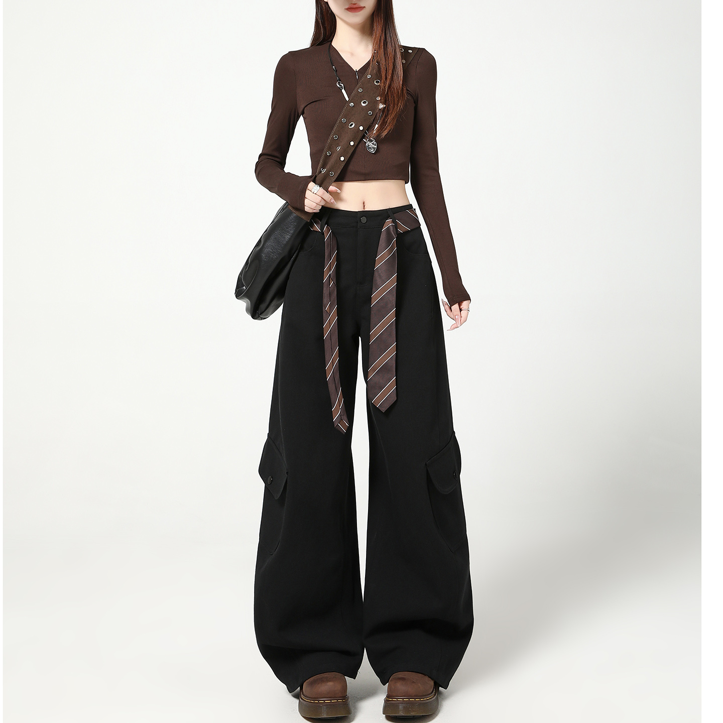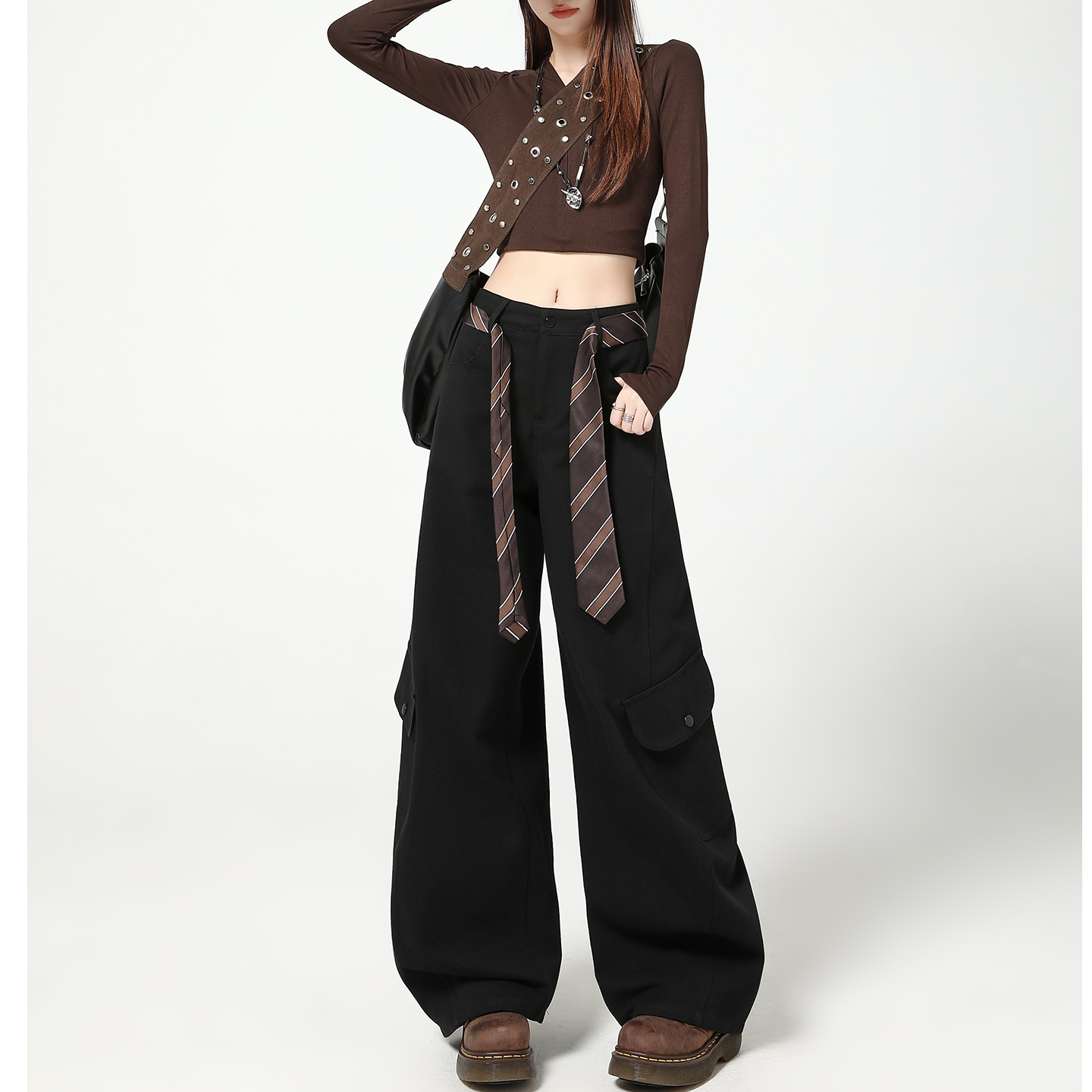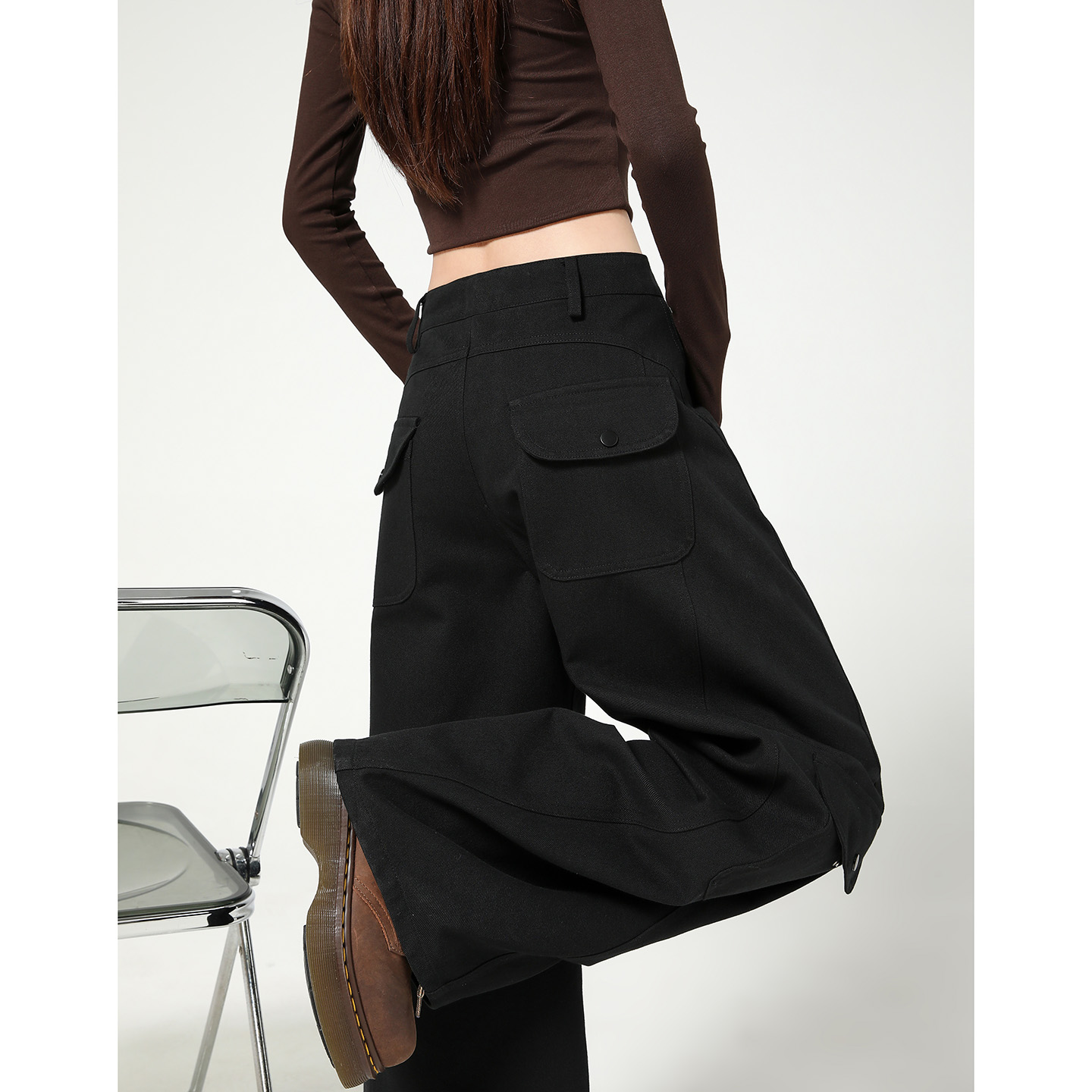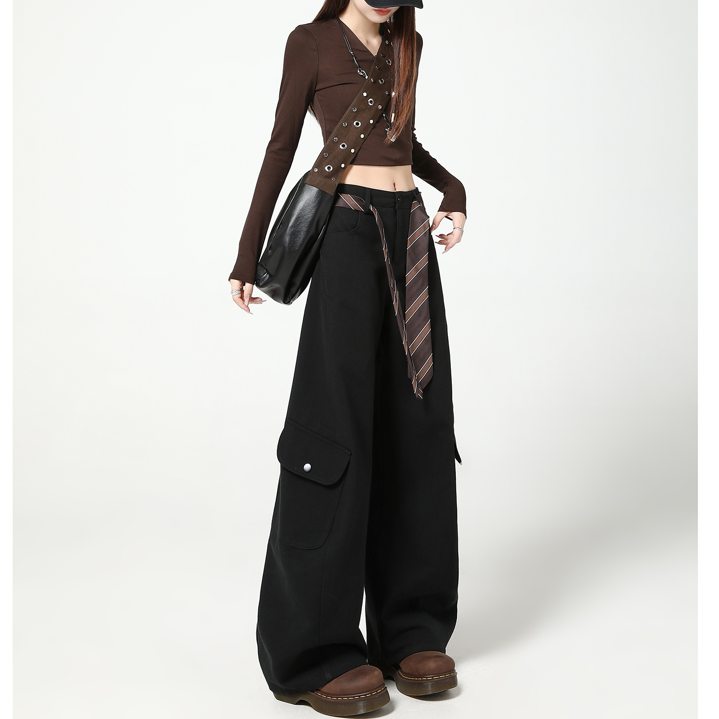 女2025秋季 裤 新款 工装 阔腿宽松显瘦高级感美式 黑色高腰弯刀休闲裤