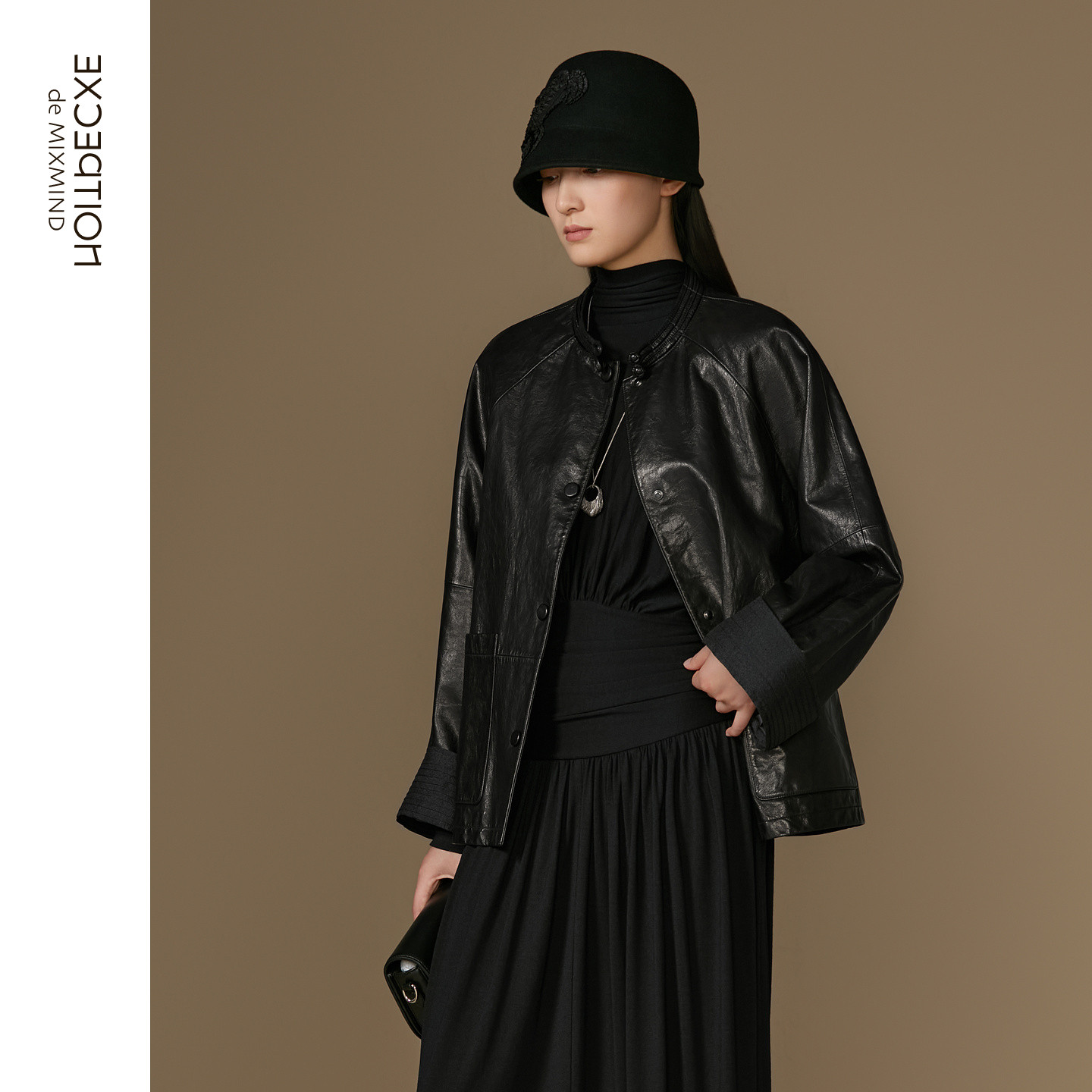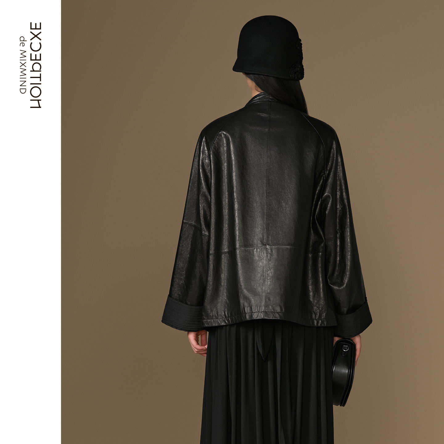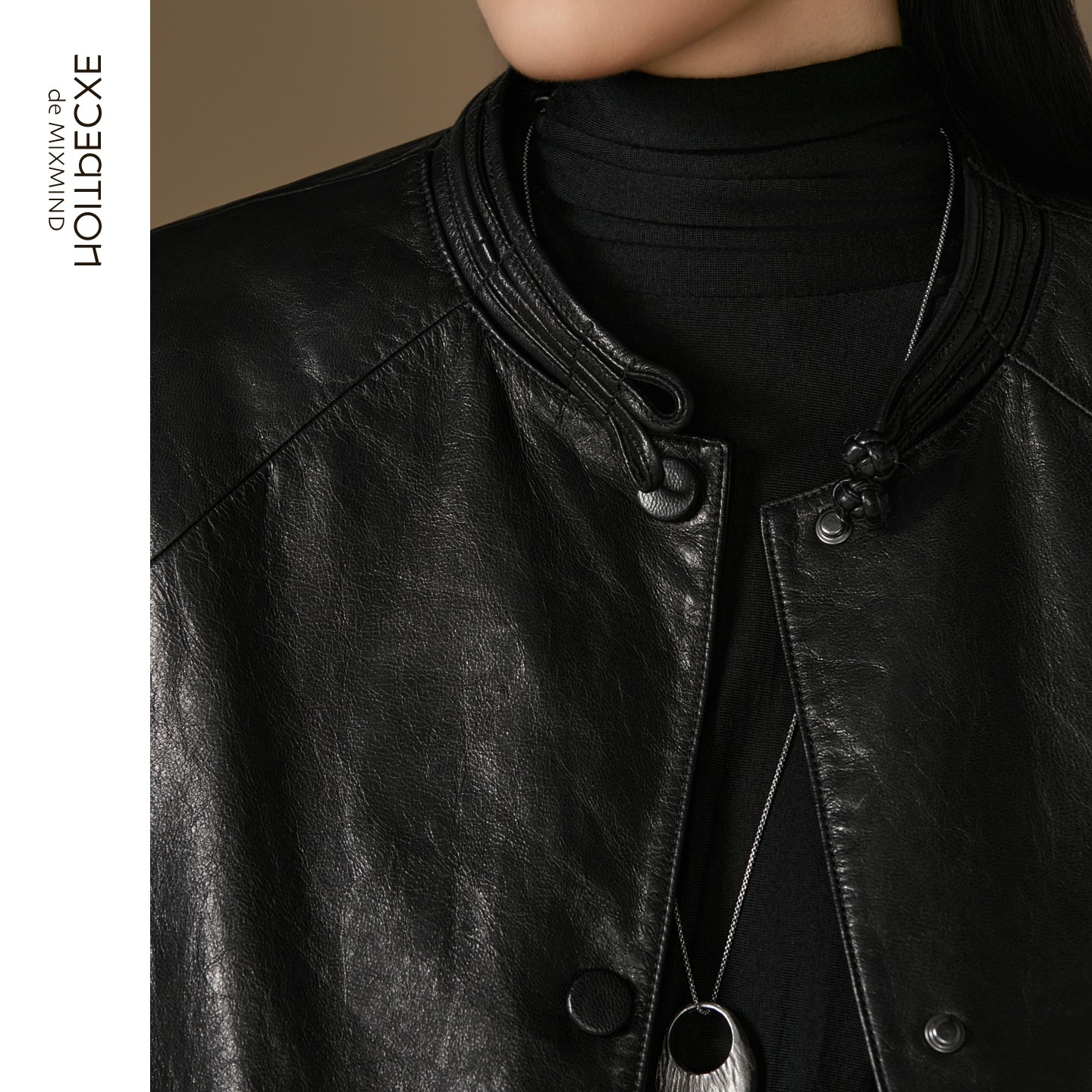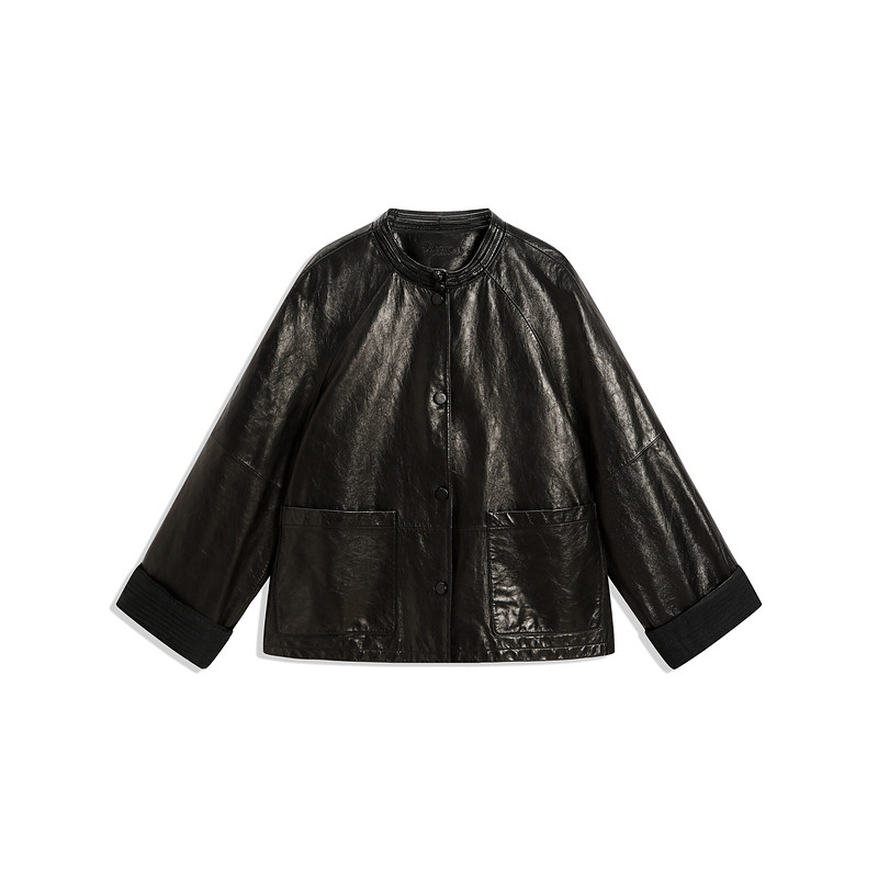 打褶新中式 细腻小羊皮落肩袖 皮衣 中式 EXCEPTION例外女装