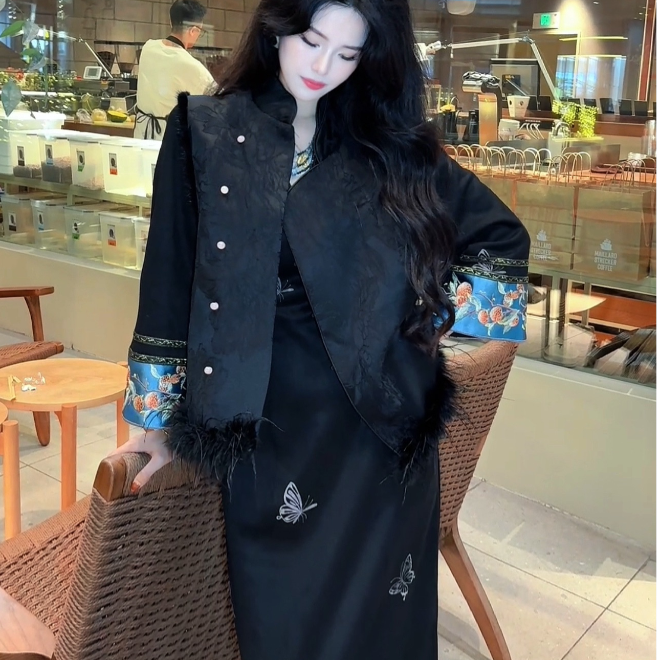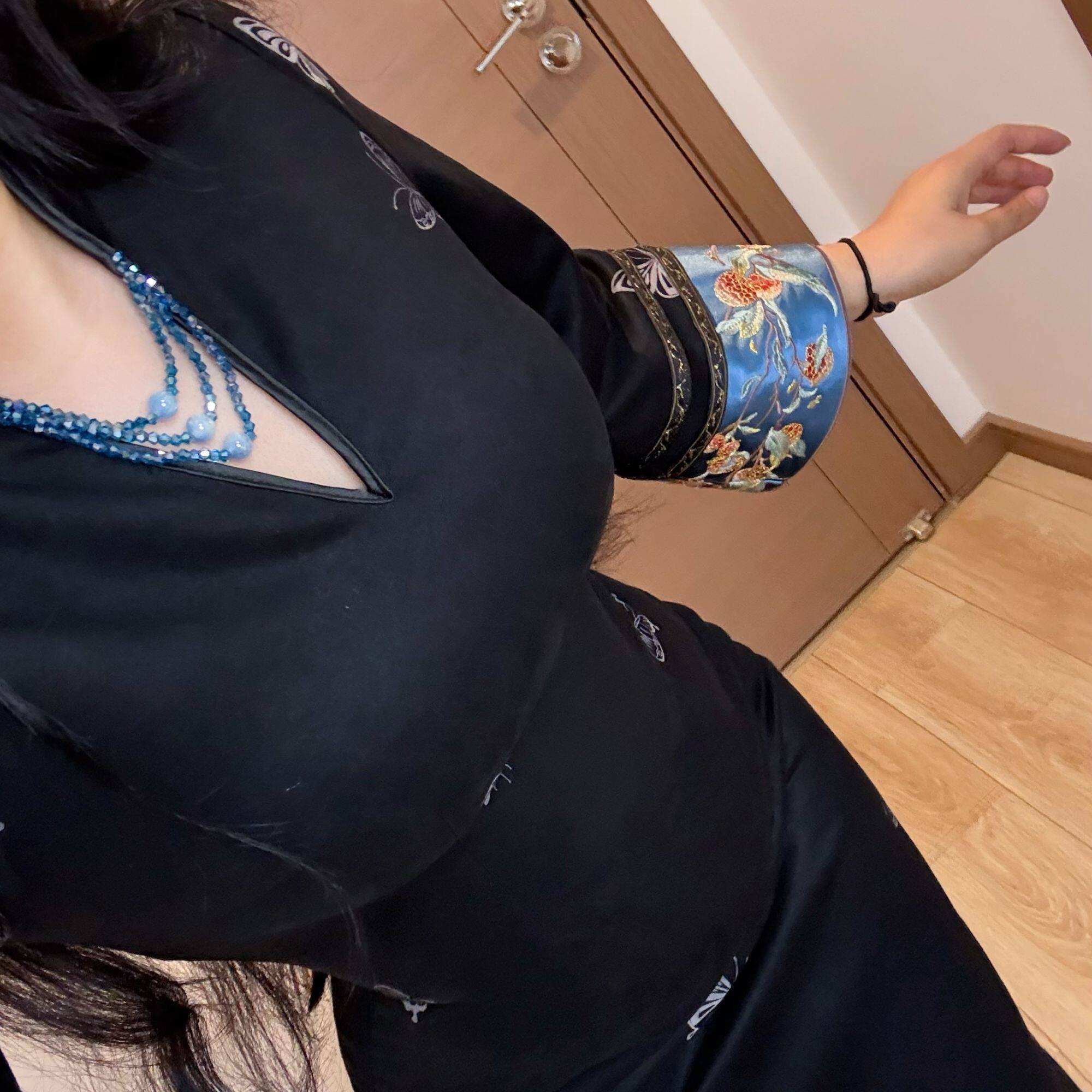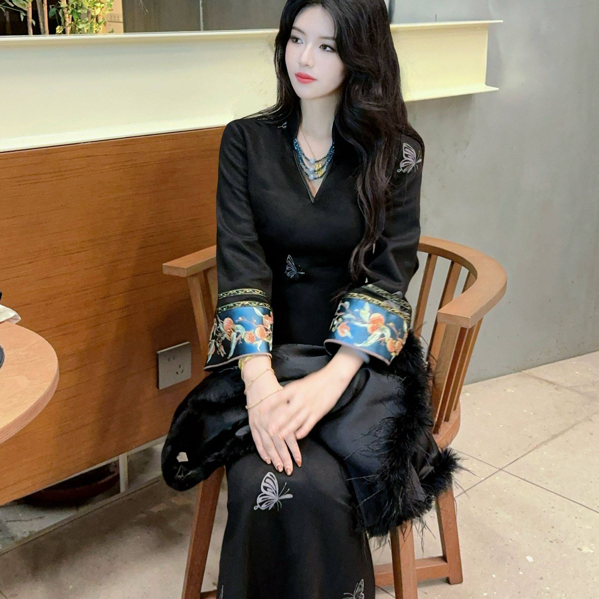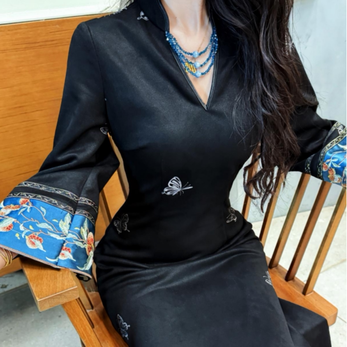 LHMknk1画报夫人原创自制秋冬温柔麂皮绒刺绣珠链旗袍 蓝香蝶