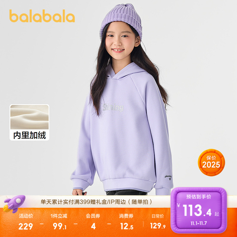 卫衣女童加绒保暖秋冬连帽上衣休闲百搭时尚 巴拉巴拉童装 儿童长袖