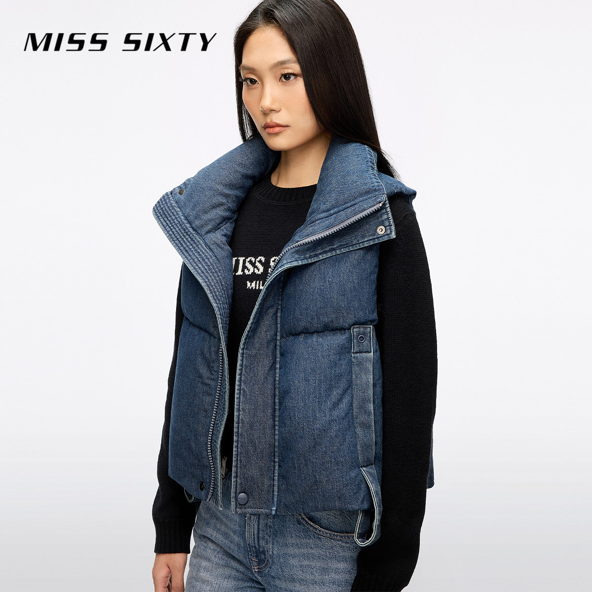 新款 Sixty2025冬季 Miss 牛仔羽绒马甲背心立领 保暖90鸭绒鹅绒