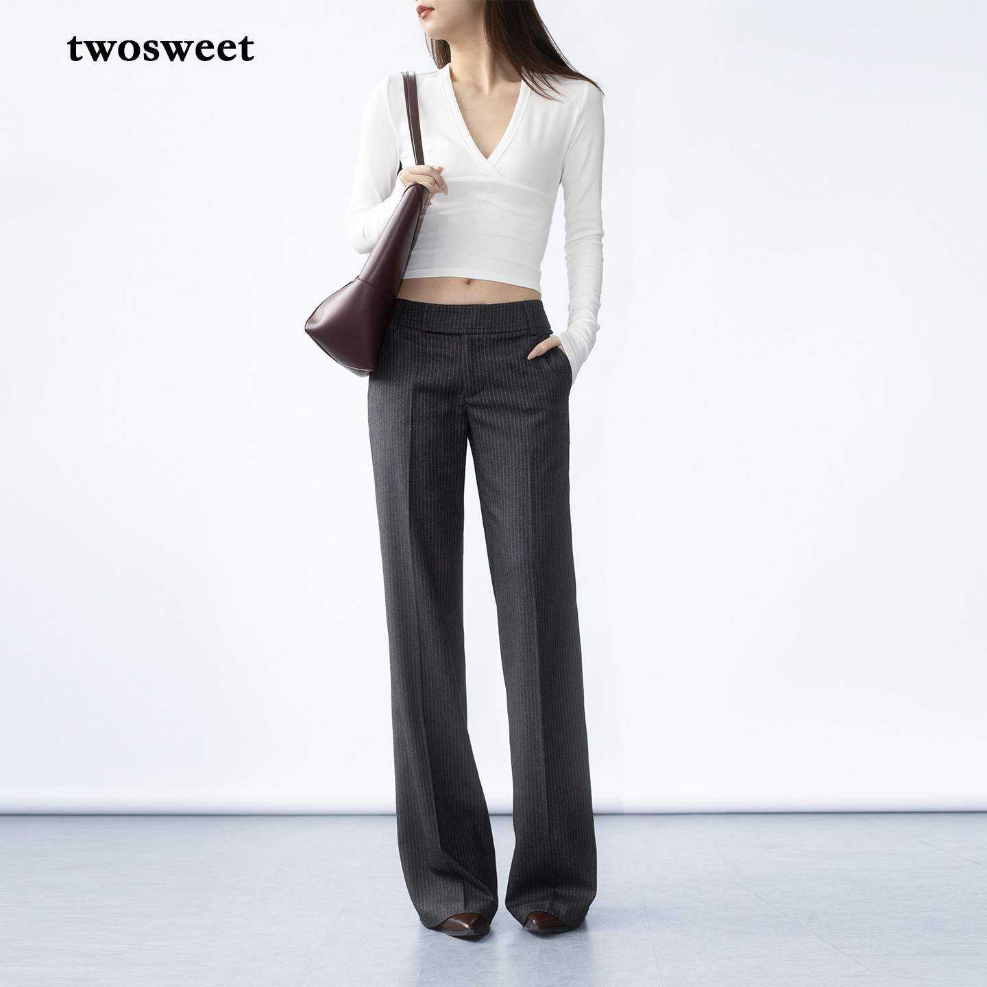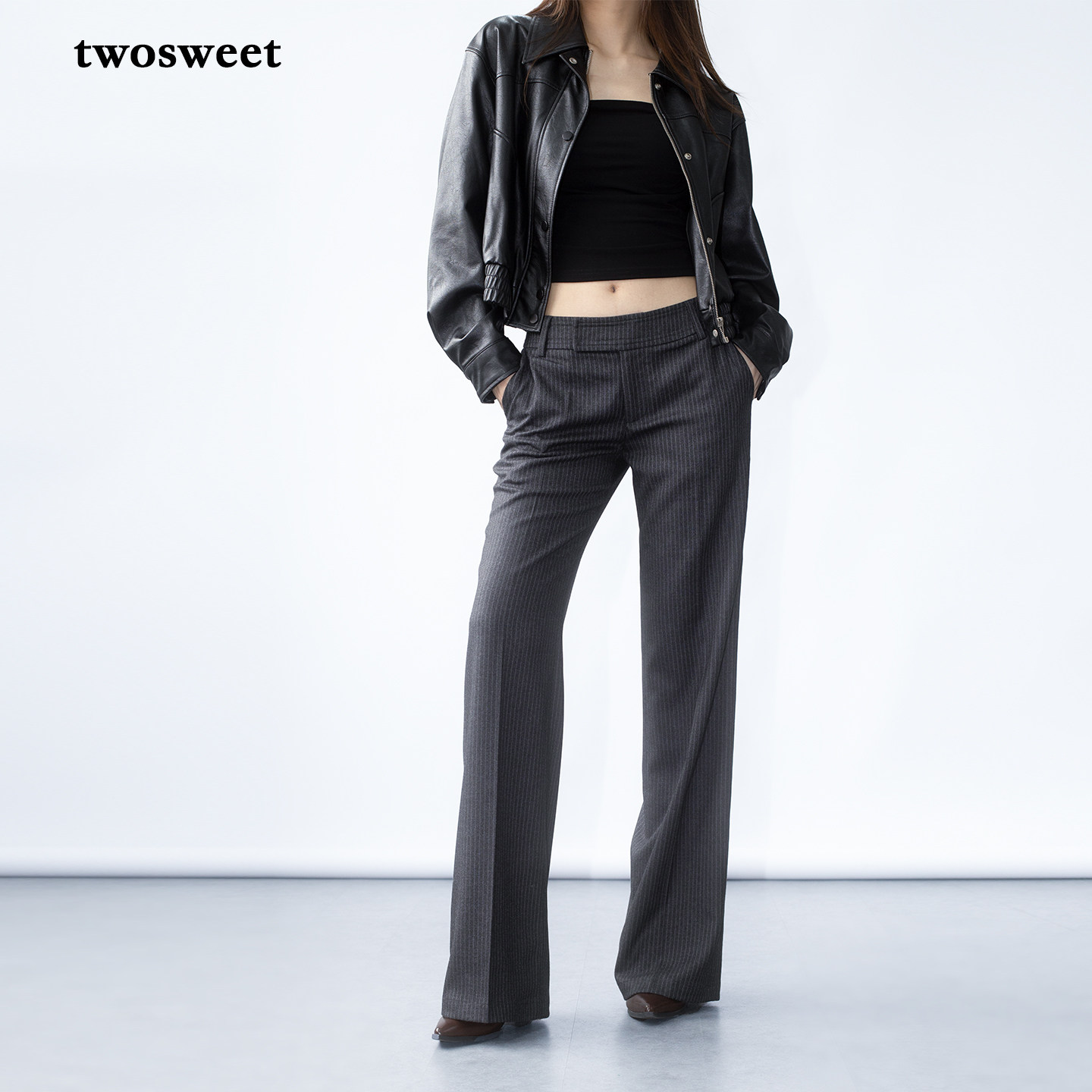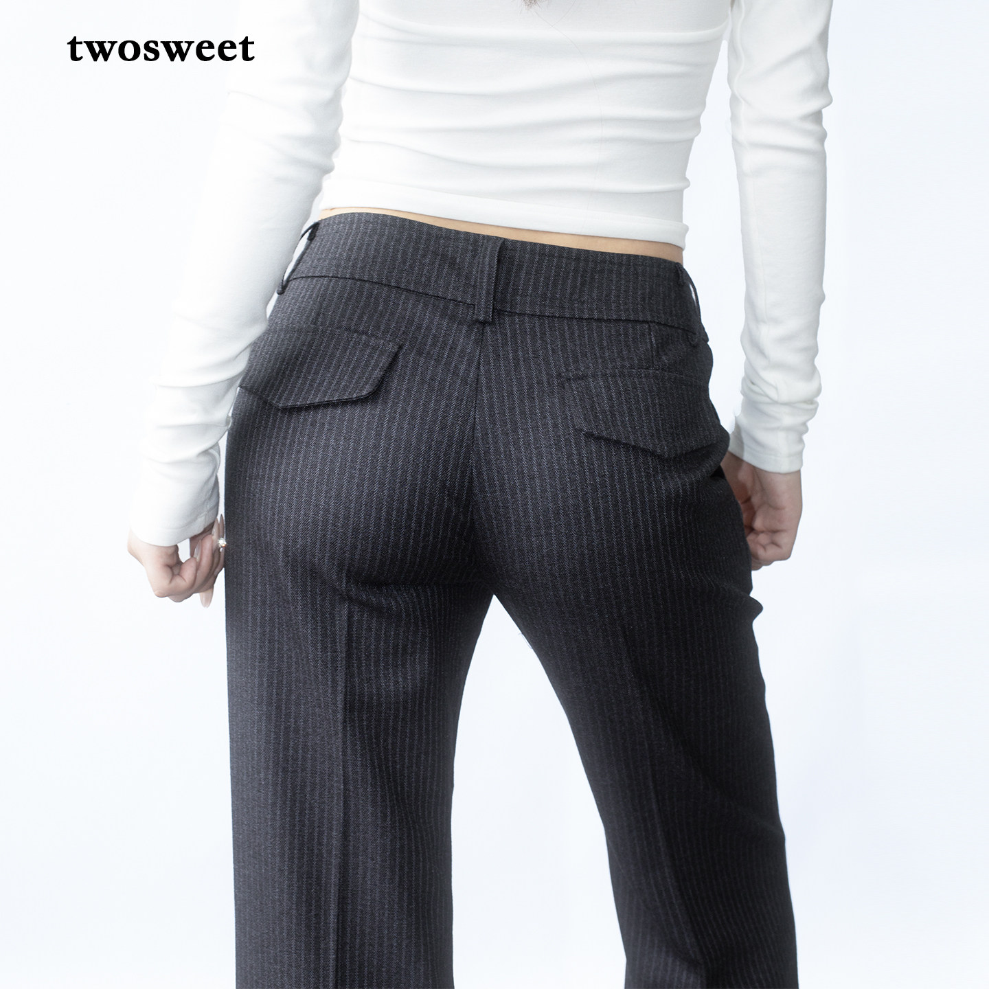 TR条纹长裤 时髦智性中低腰直筒烟管微喇西裤 律政俏佳人 twosweet
