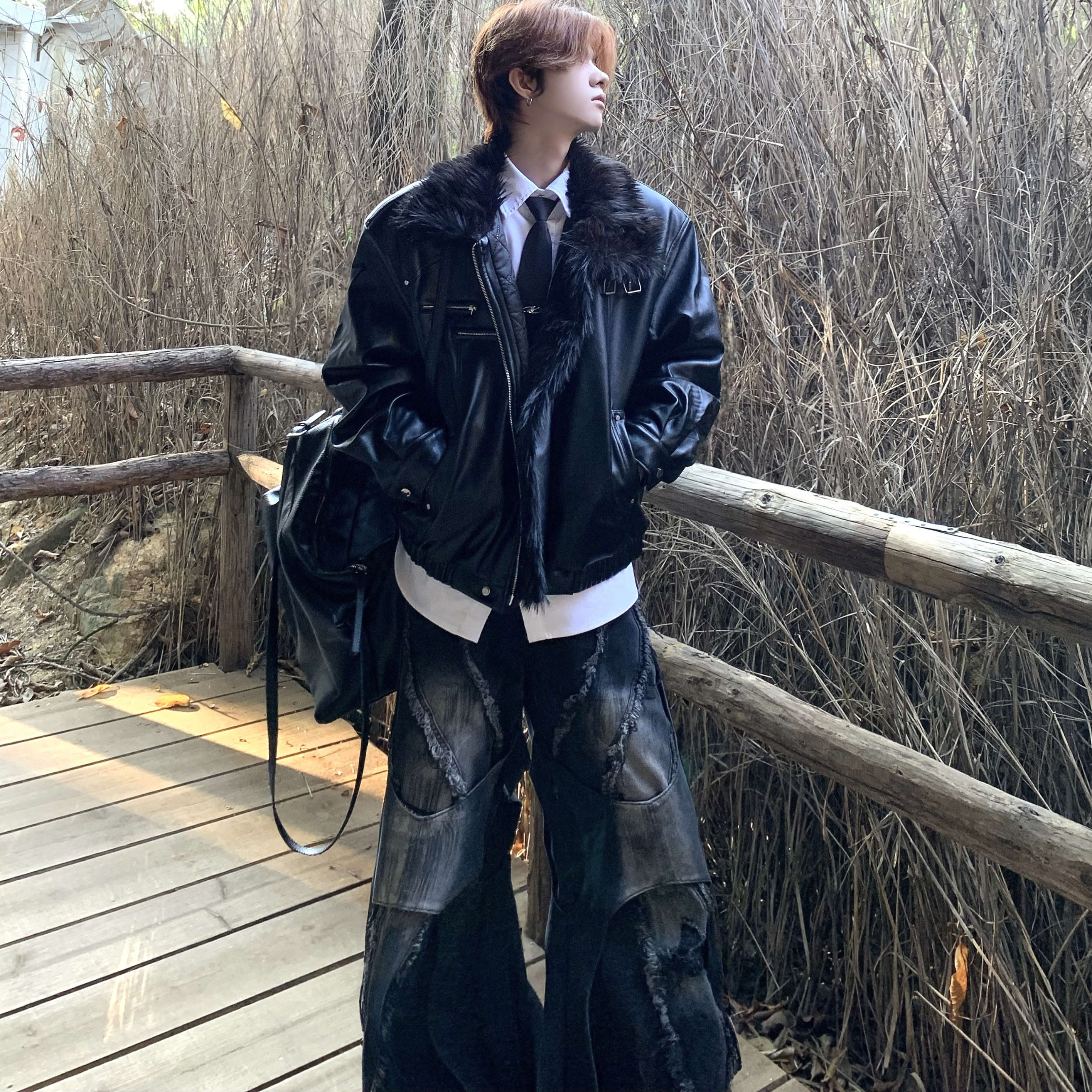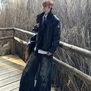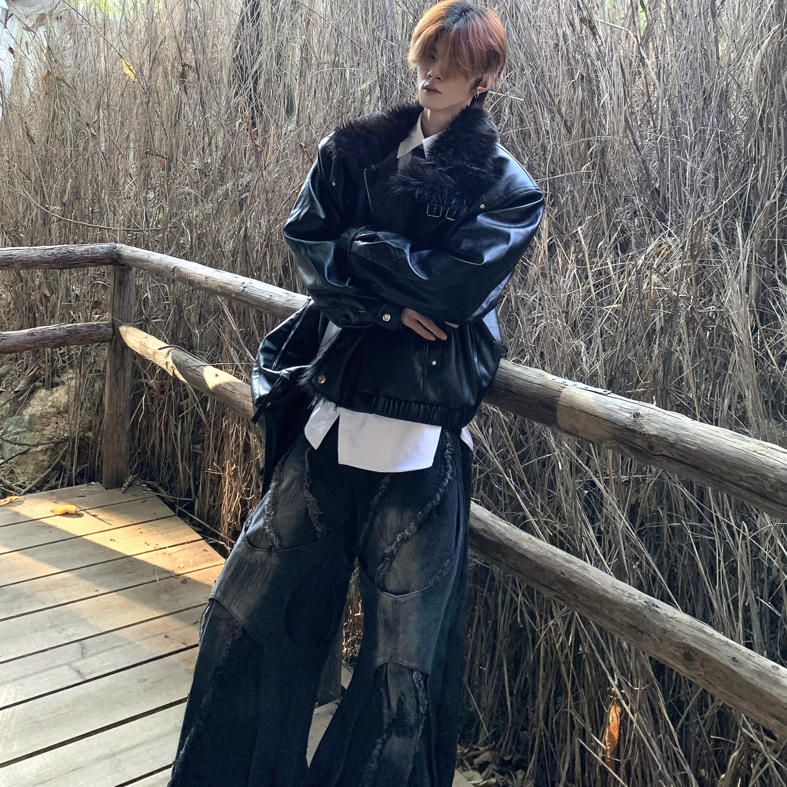 Med老叔 高街保暖机车大毛领拼接夹棉皮衣休闲百搭痞帅夹克棉服潮