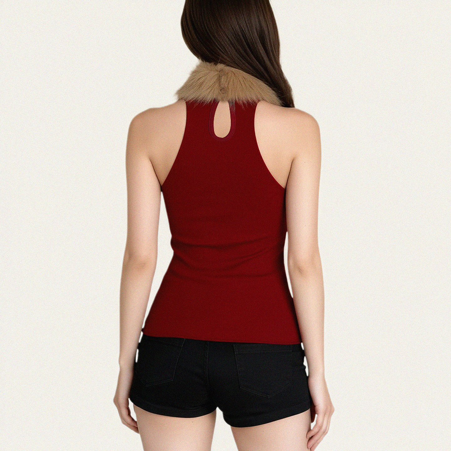 背心圣诞简约修身 复古红色毛领拼接无袖 收腰针织上衣 美式 FUNOFF
