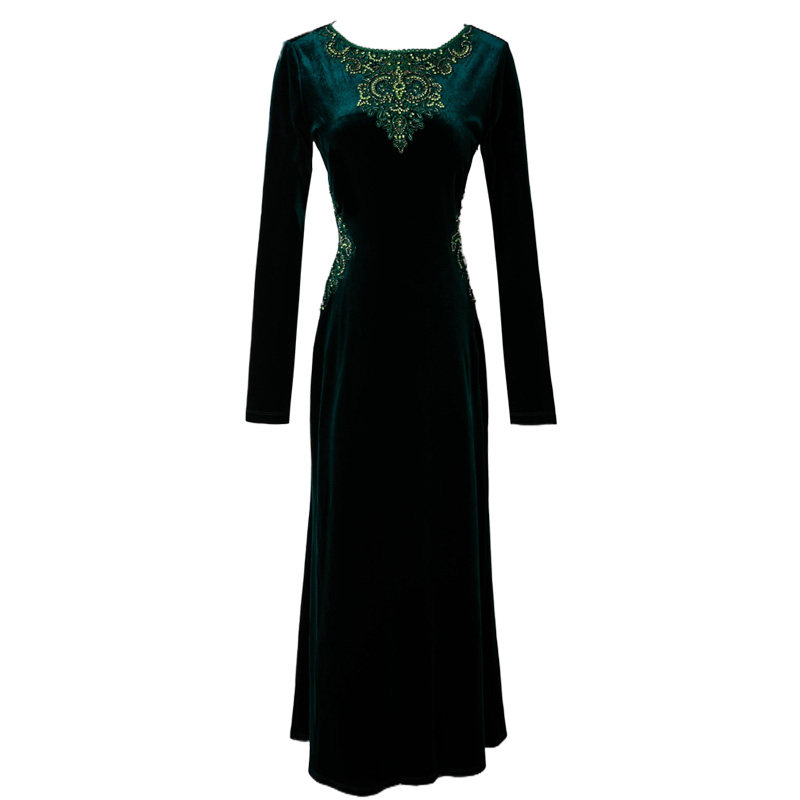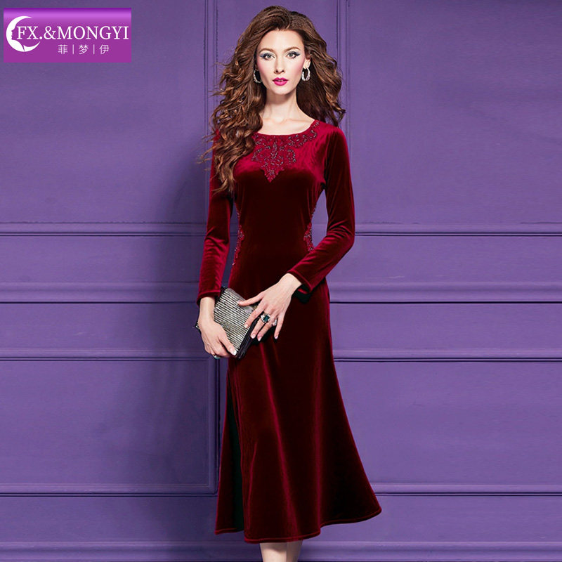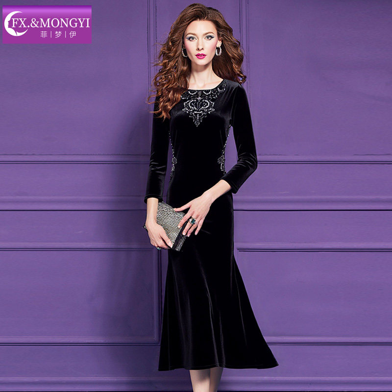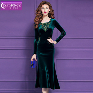 菲梦伊金丝绒绣花连衣裙女冬季 复古高级感轻熟收腰打底礼服裙 法式