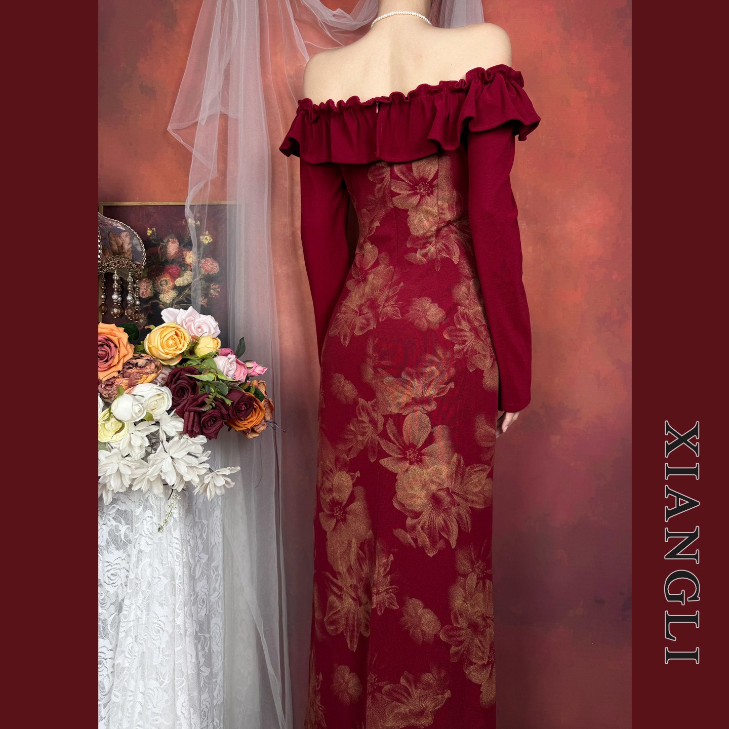褶皱收腰长裙 微胖御姐气质斜肩荡领连衣裙女25年夏季 XZY 欣争艳