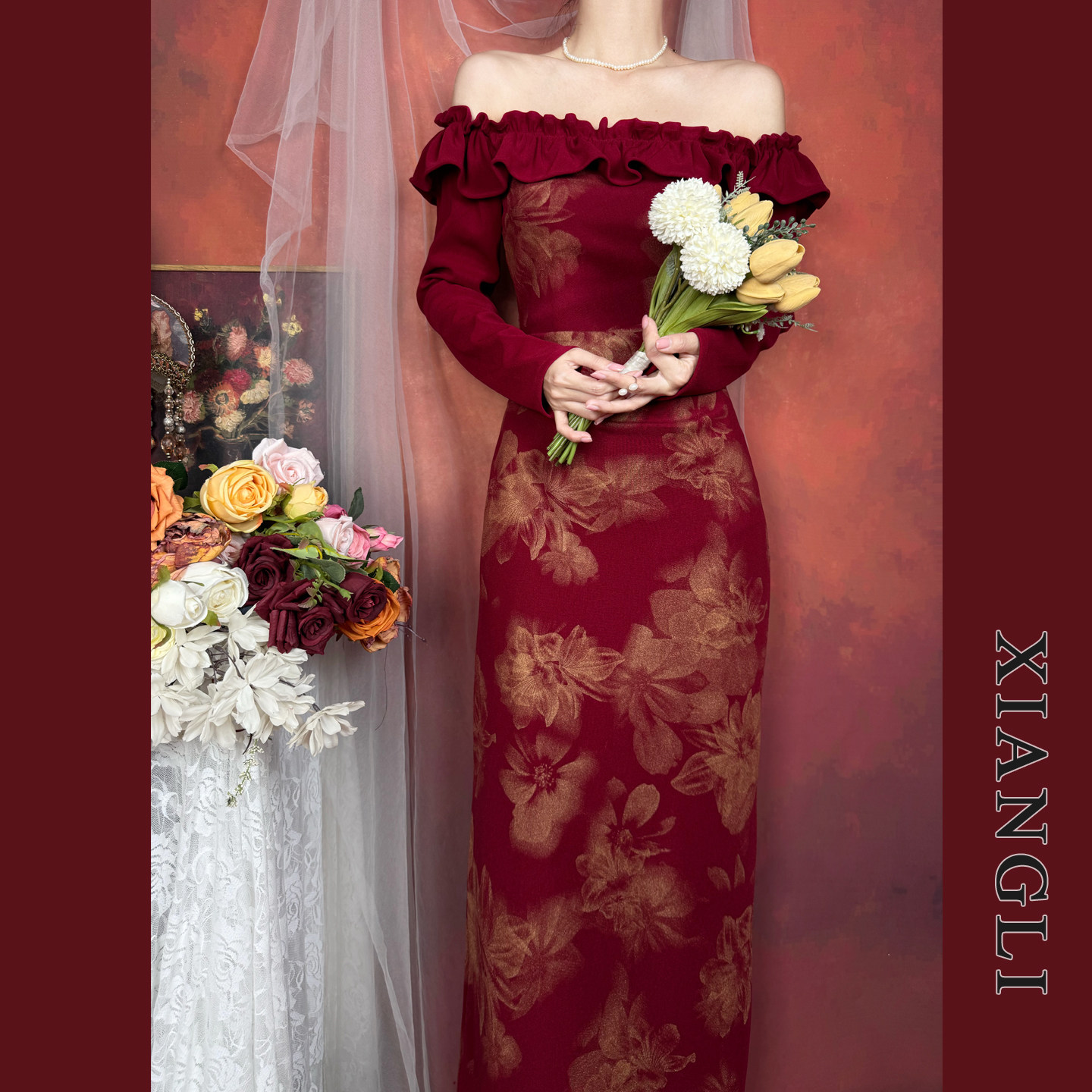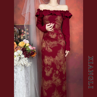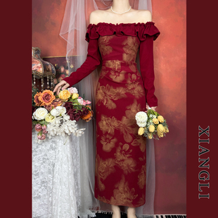 连衣裙女法式 NEVA 修身 黑色长袖 高级感一字肩气质收腰打底长裙