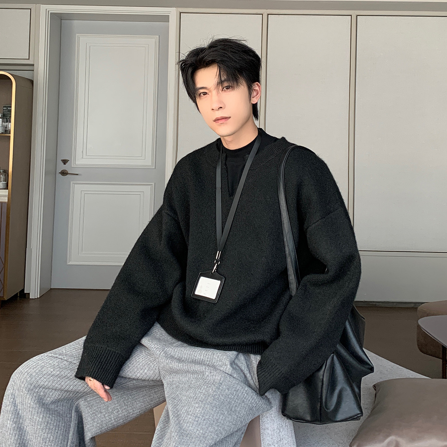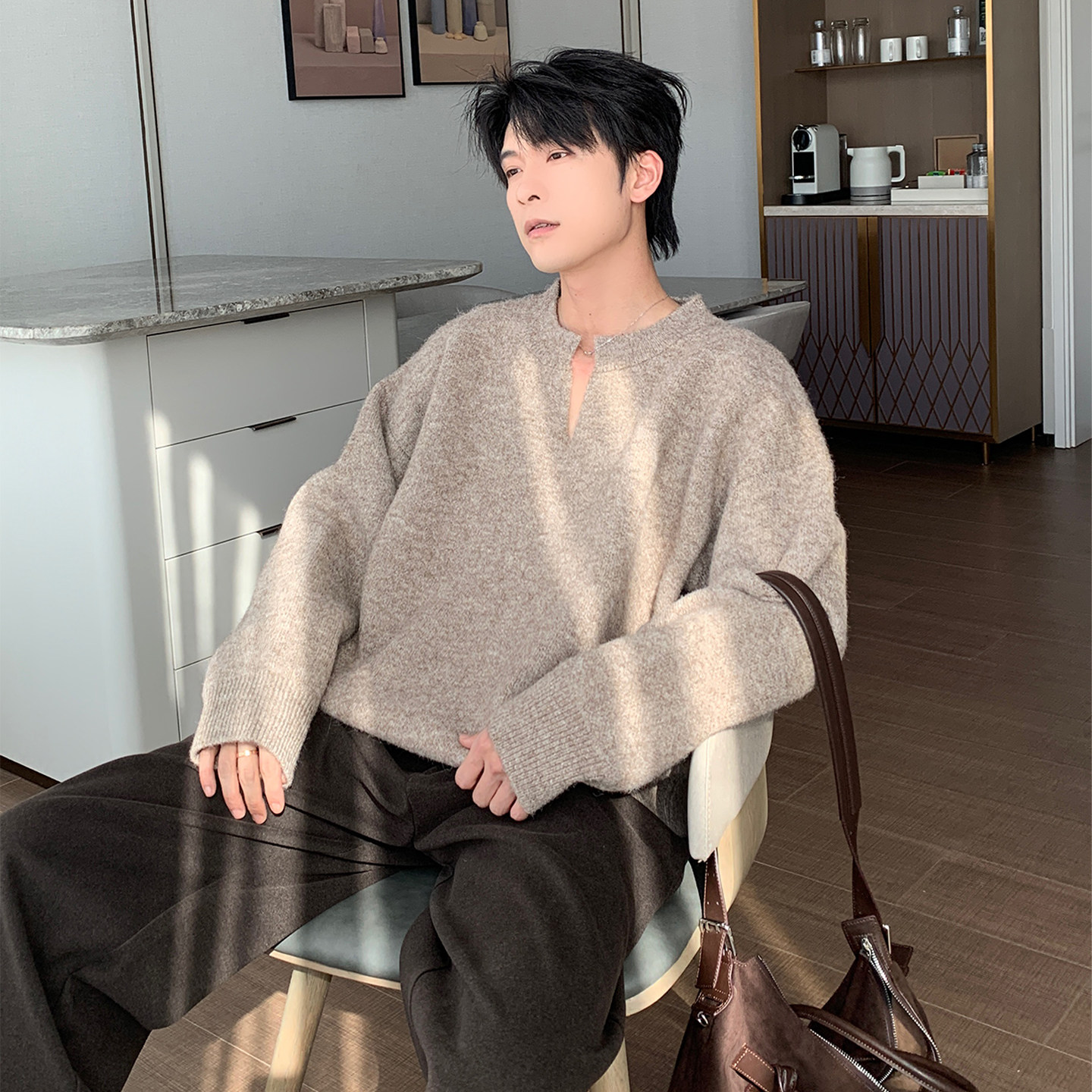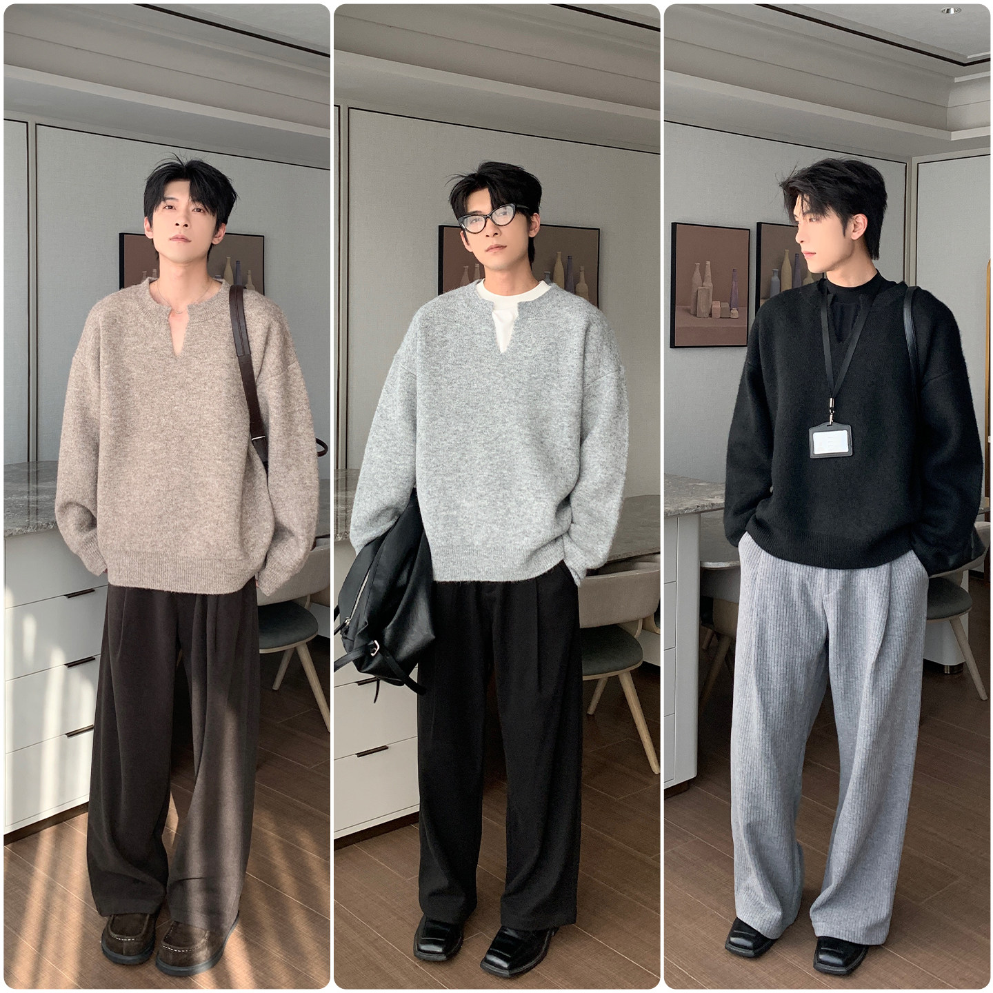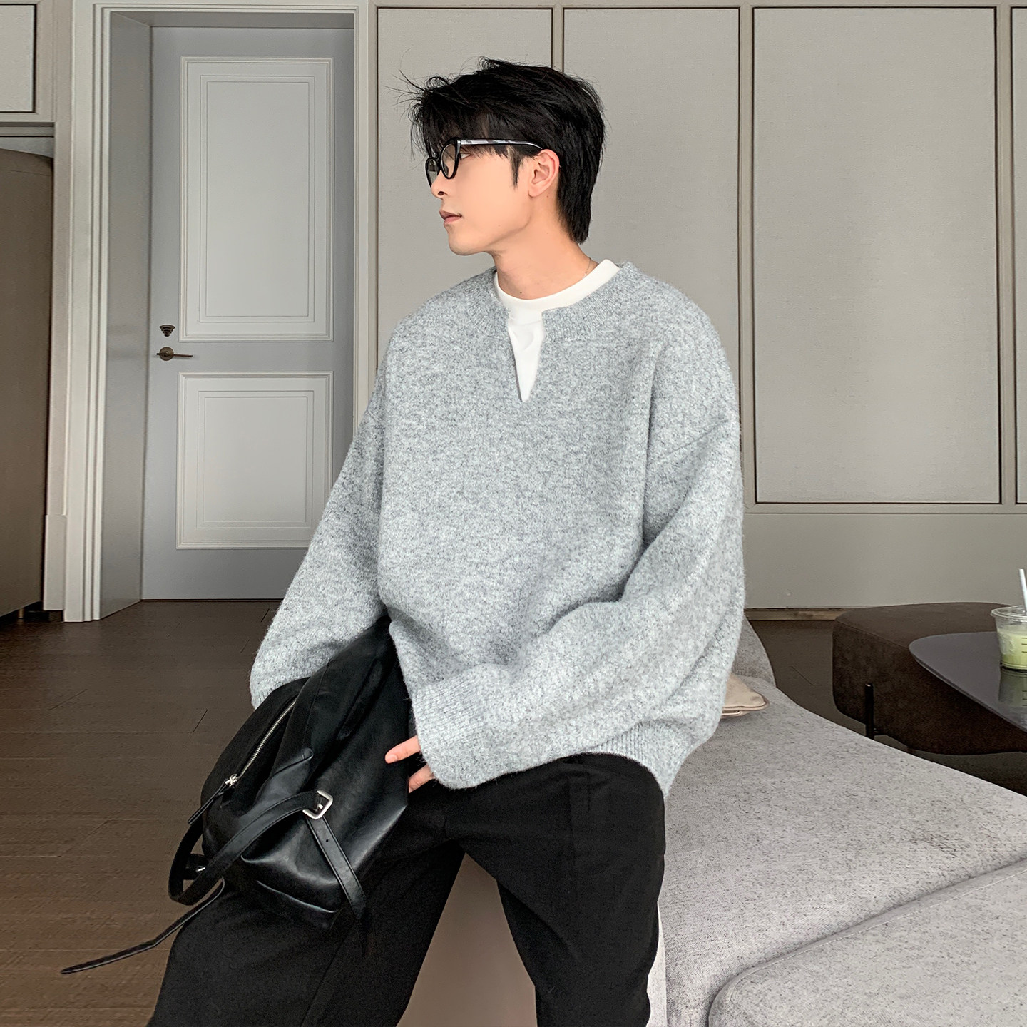 Hualun秋冬季 男生cleanfit慵懒风宽松情侣套头毛衣 加厚v领针织衫