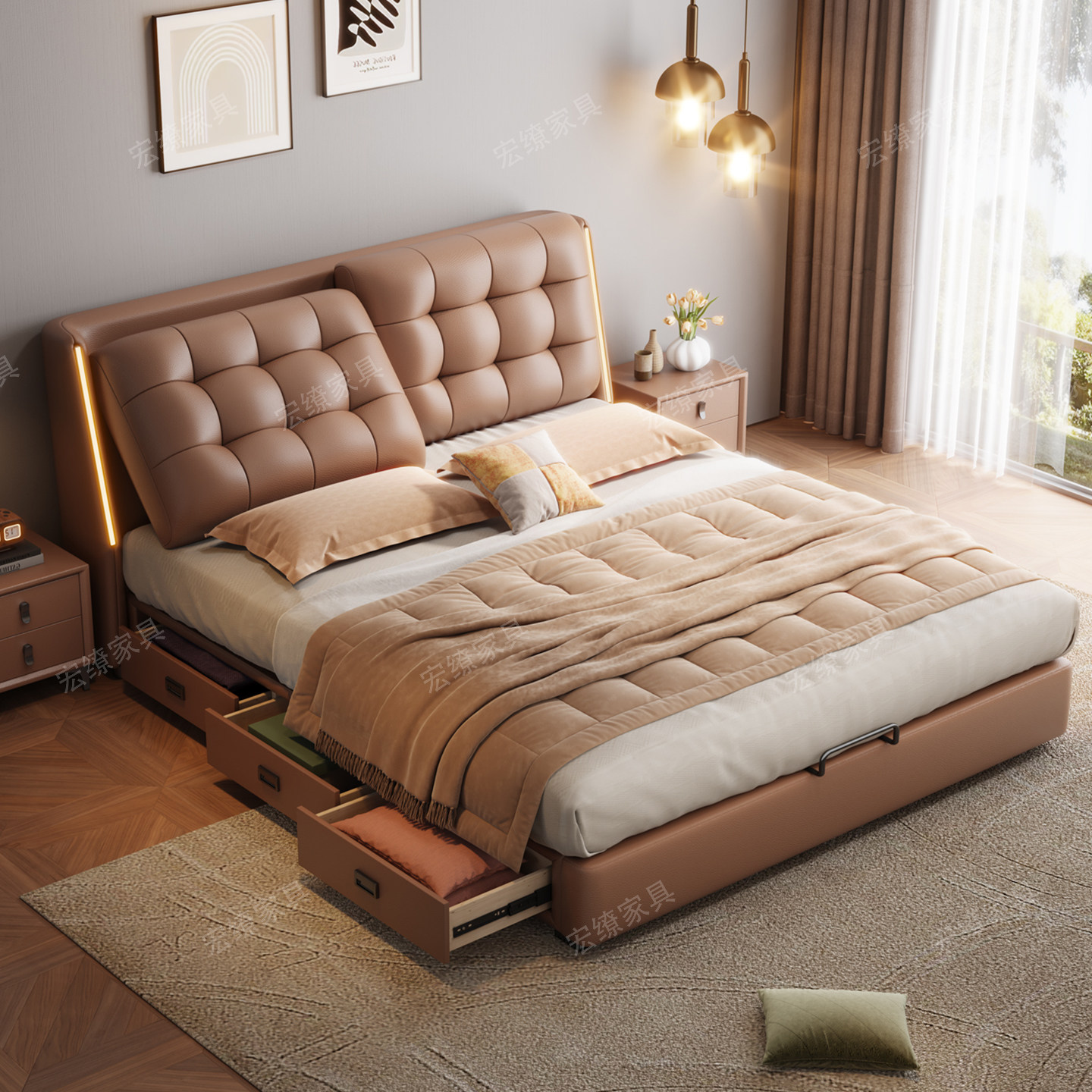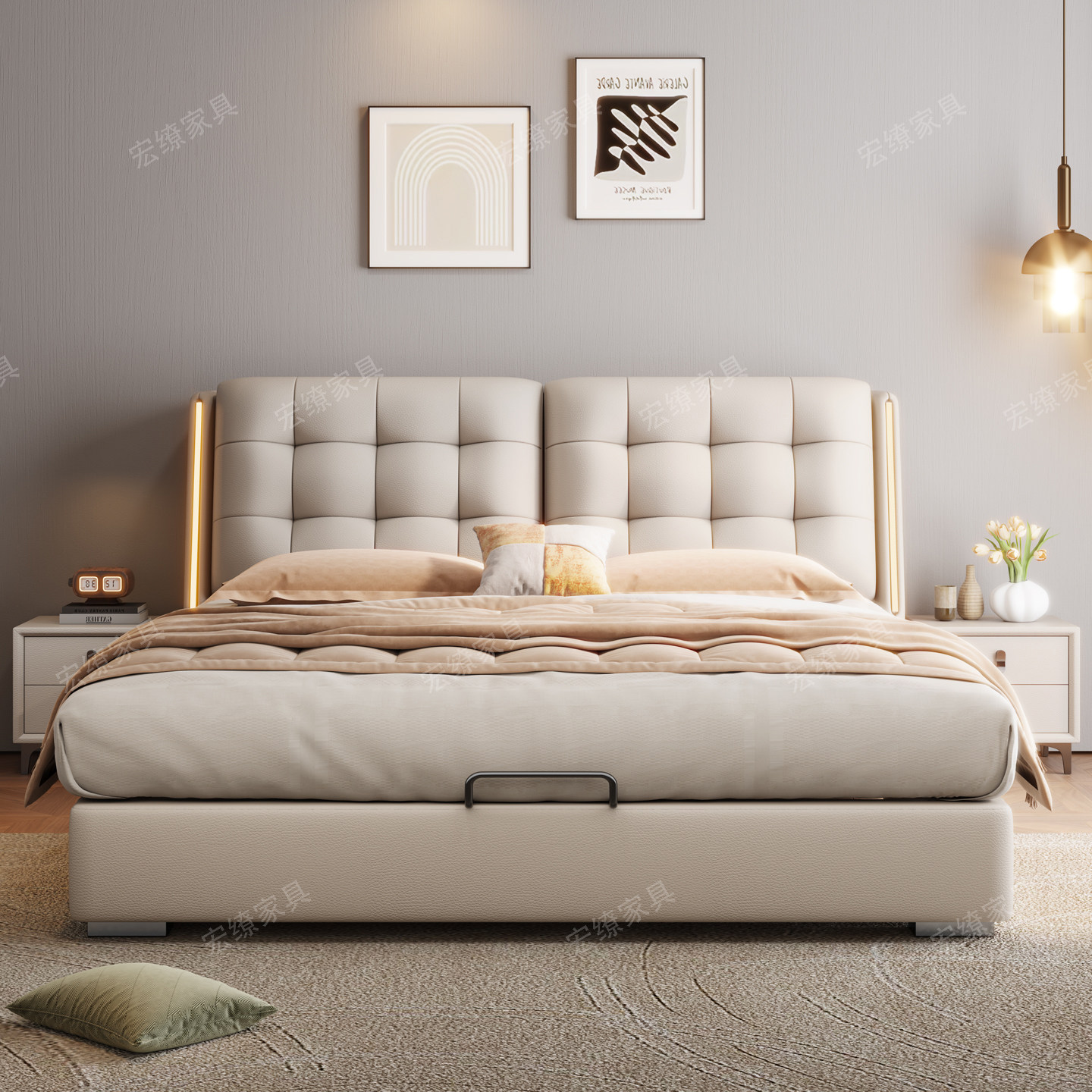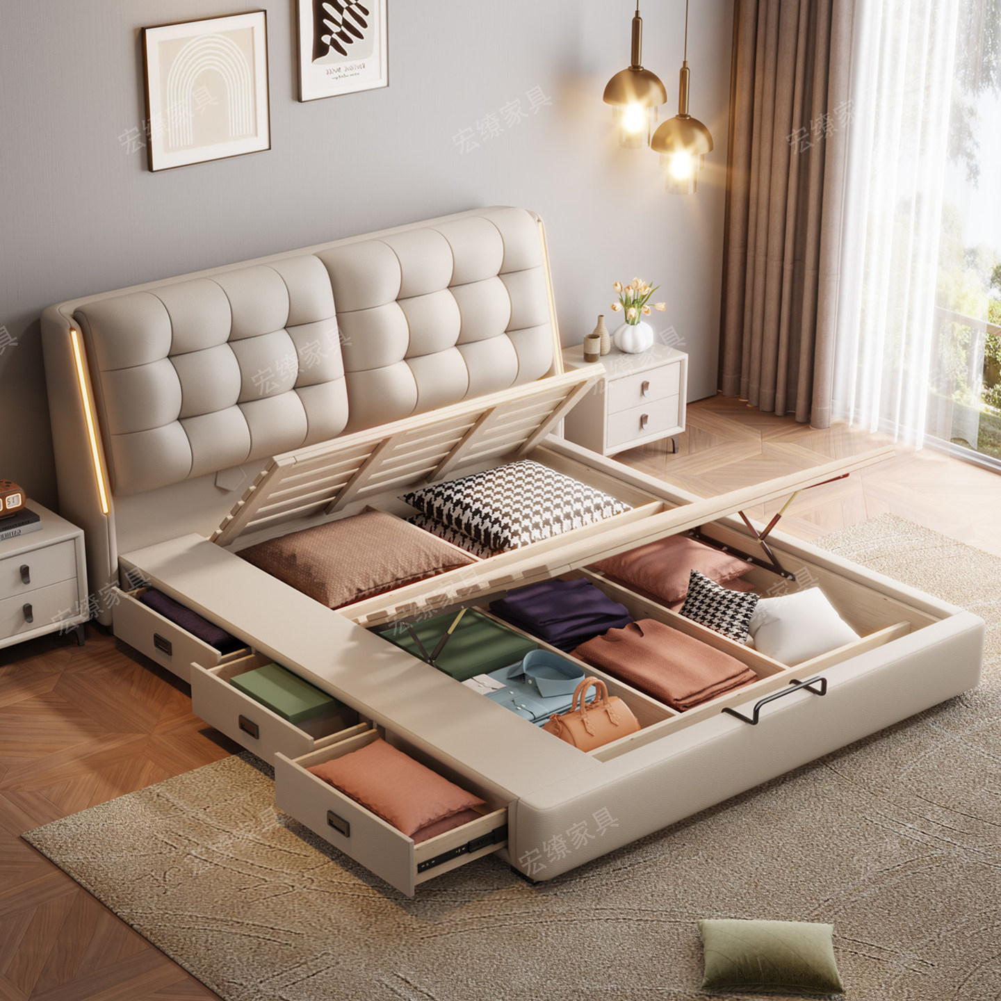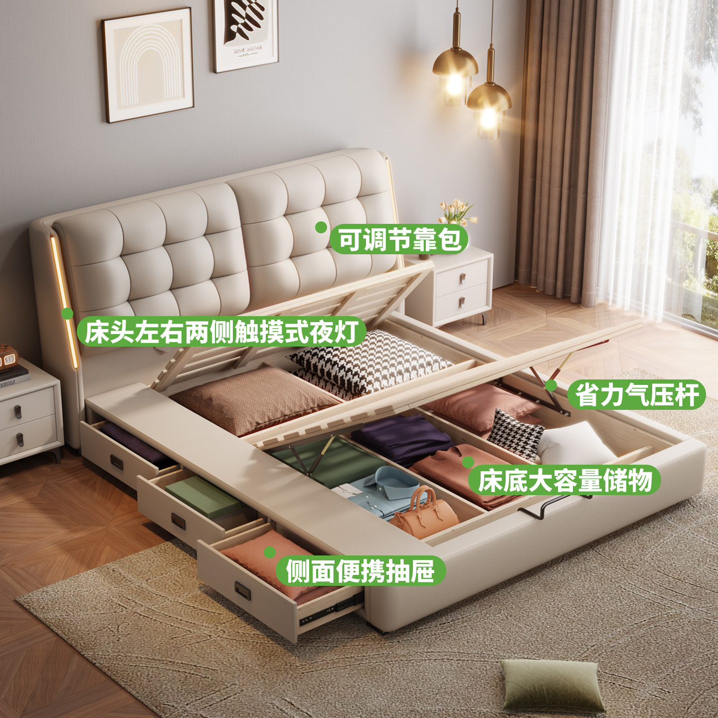 真皮床现代简约1米8双人床高端大气主卧2米x2米2储物多功能软包床