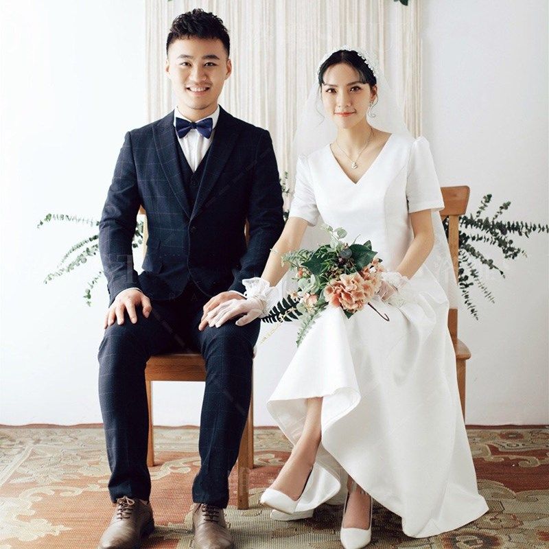 MISSQIAN一字肩缎面鱼尾裙西太后白色新娘订婚敬酒服轻婚纱旅拍女