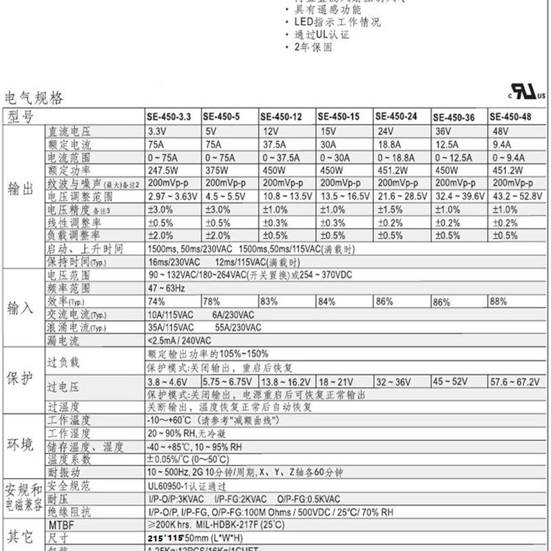 LED工控 12开关电源12V24V36V48V60V70V110V450W 明伟SE 450