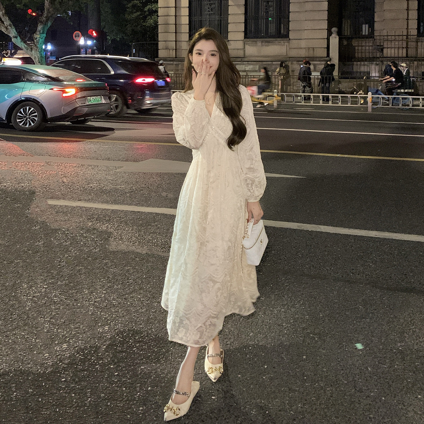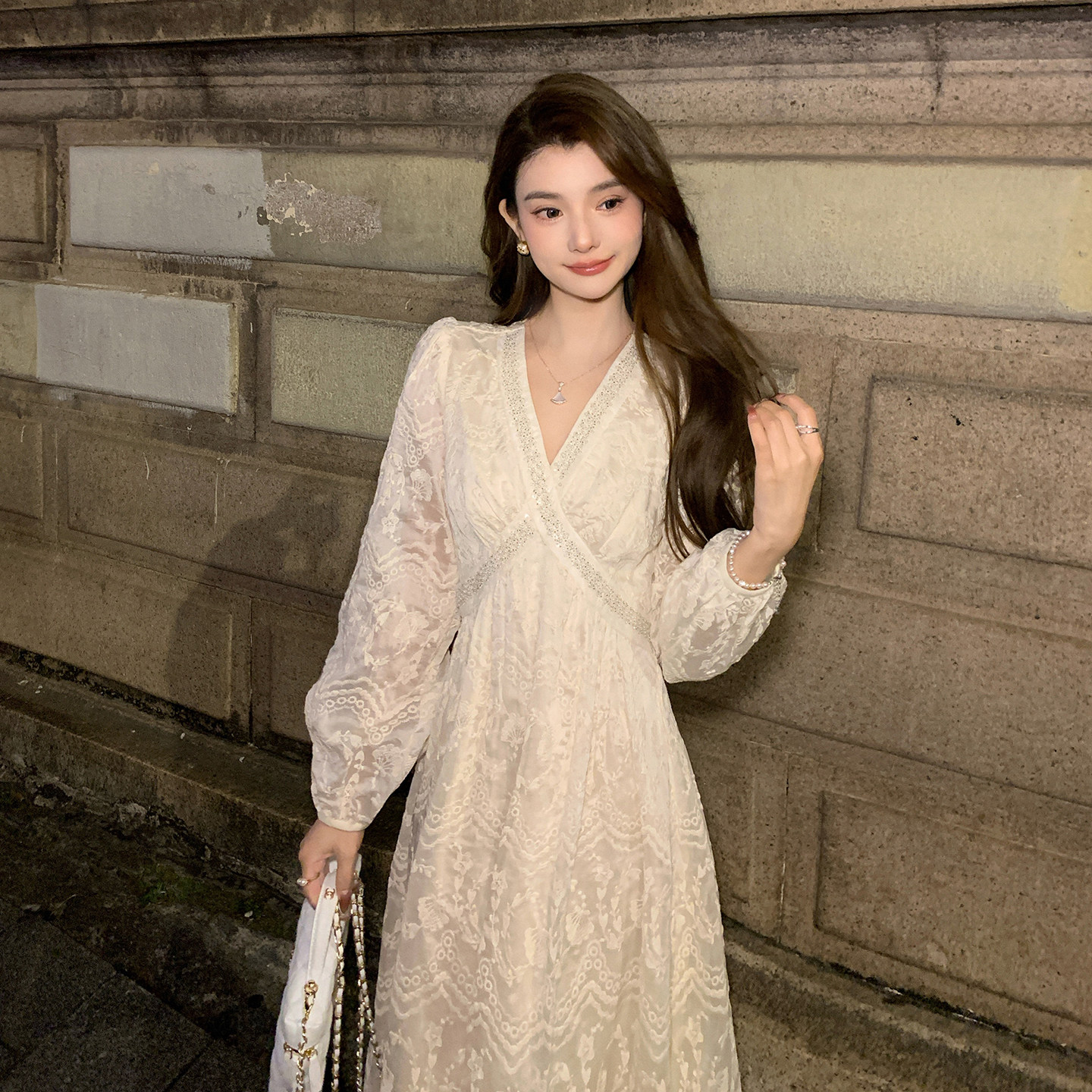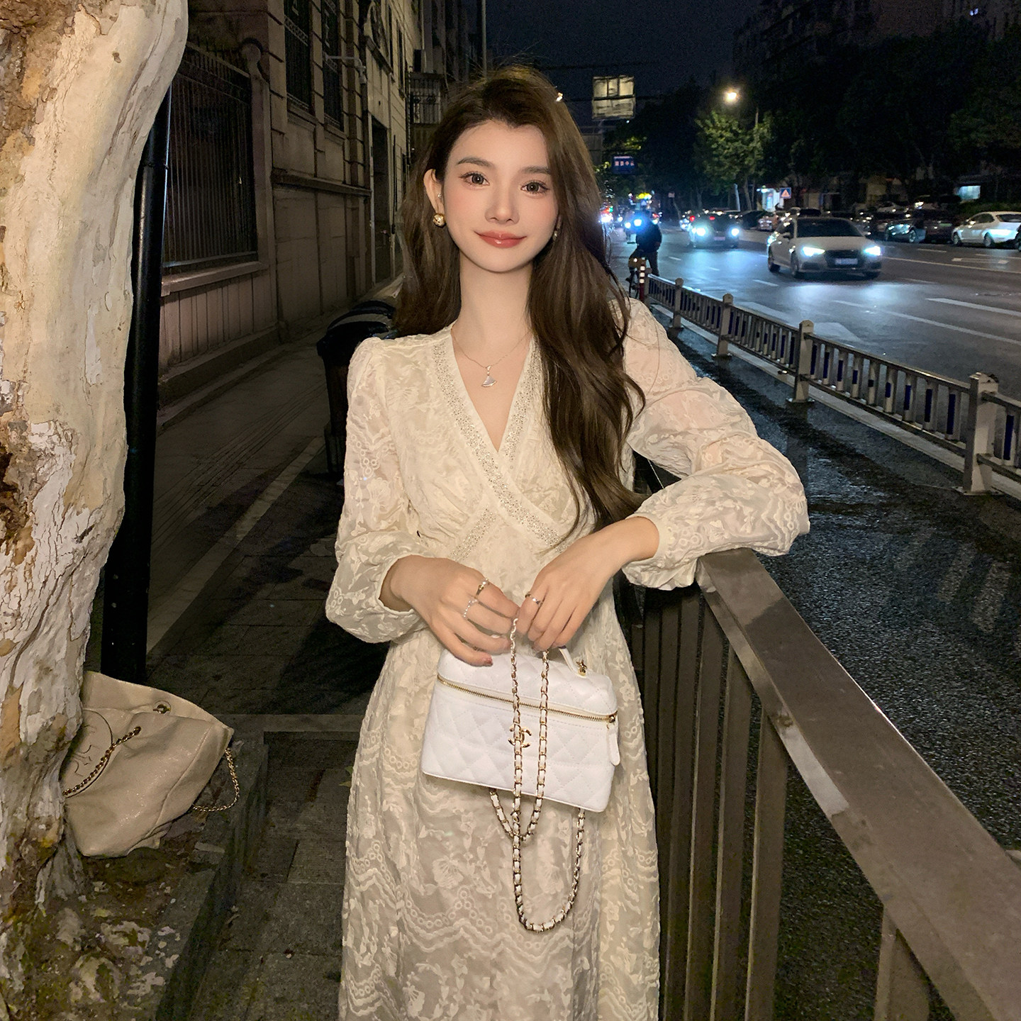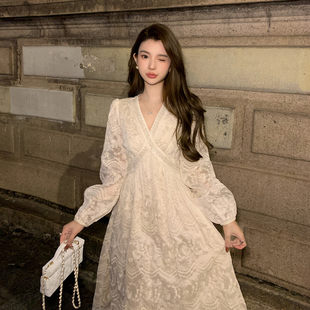 气质温柔风蕾丝连衣裙显瘦v领仙女裙轻奢绝美长裙子 NANA法式