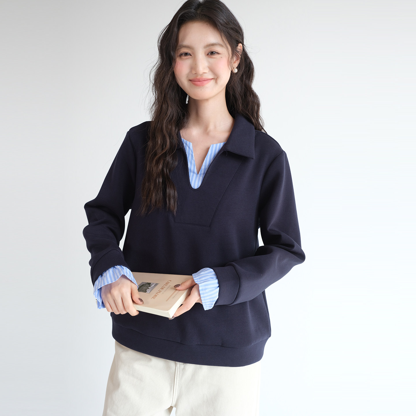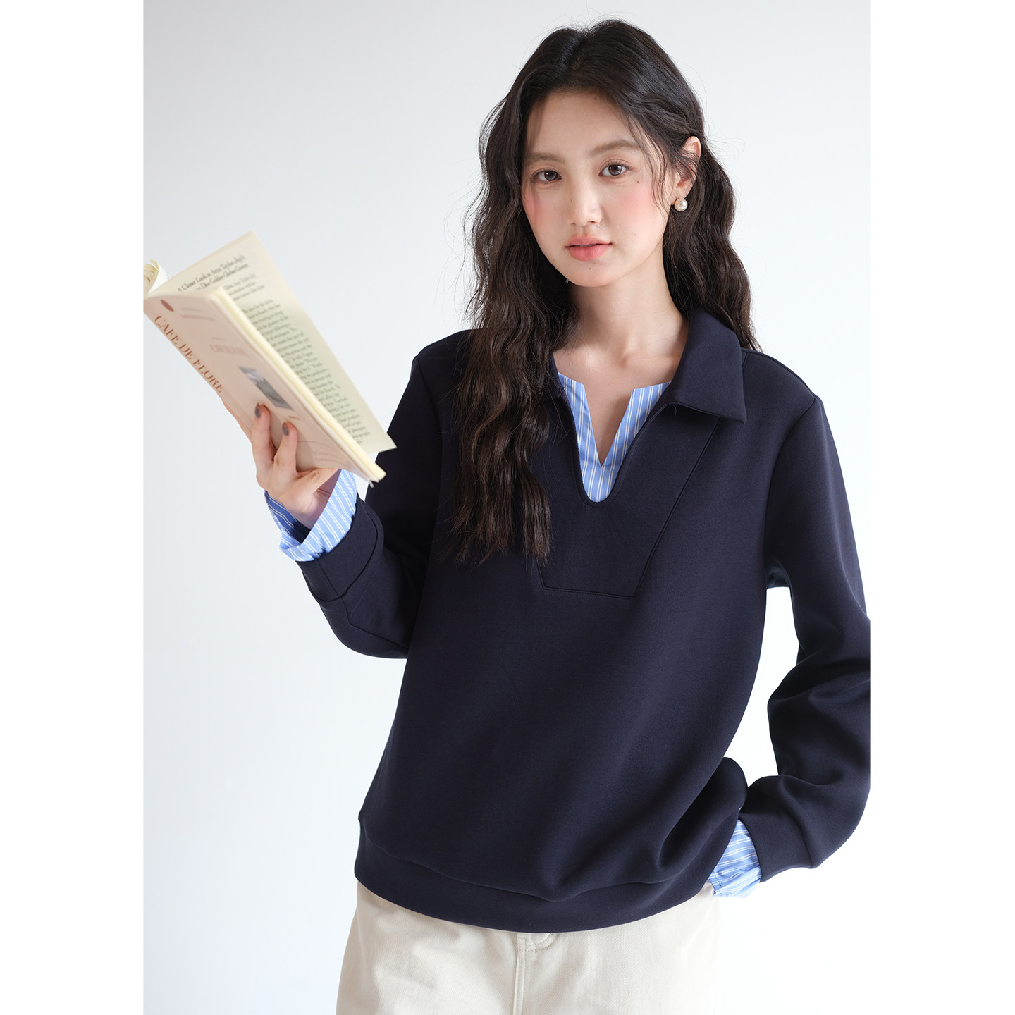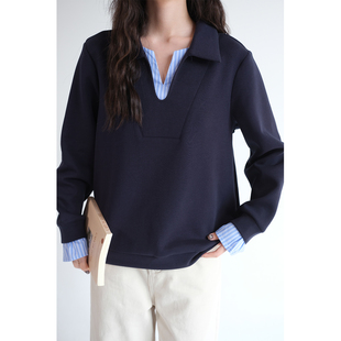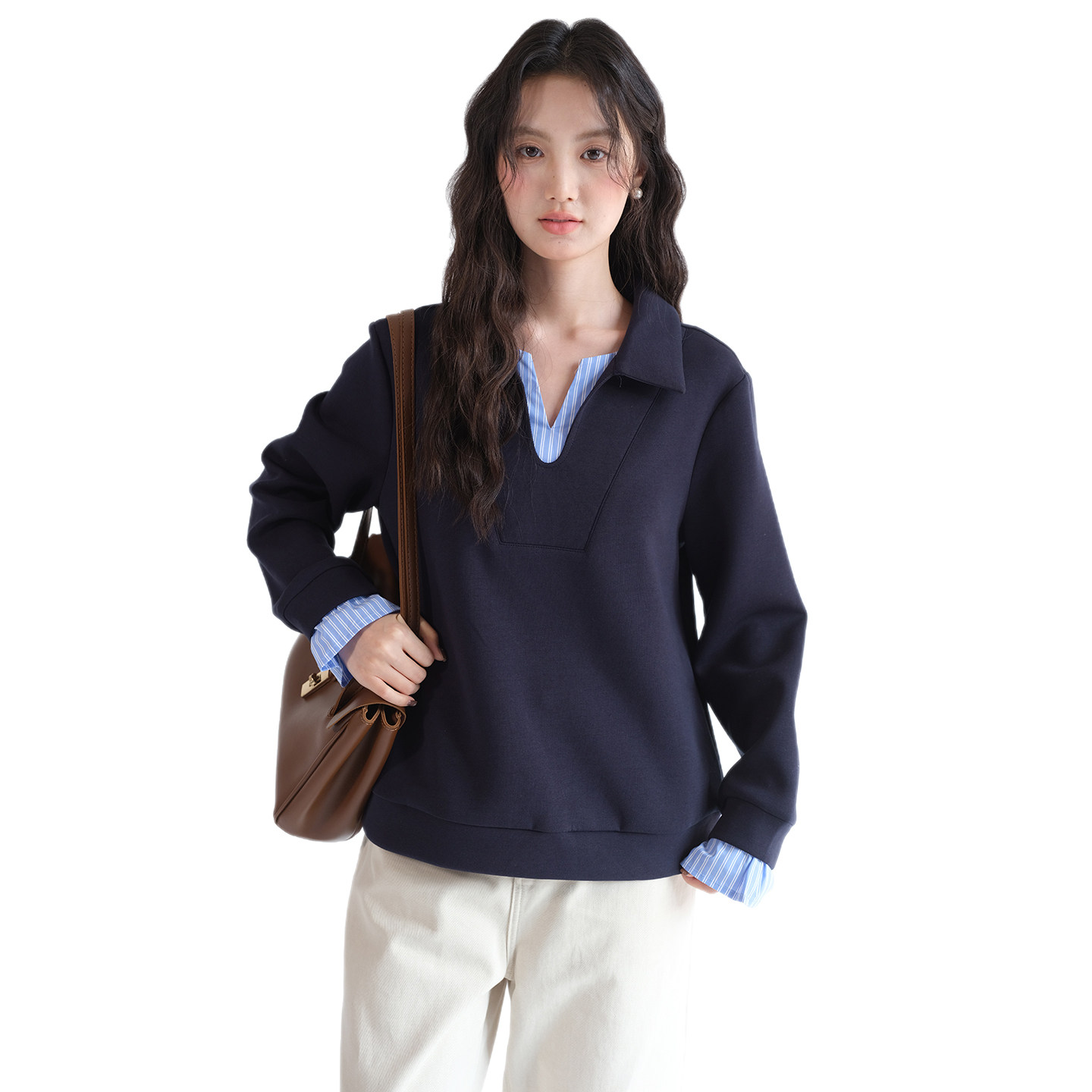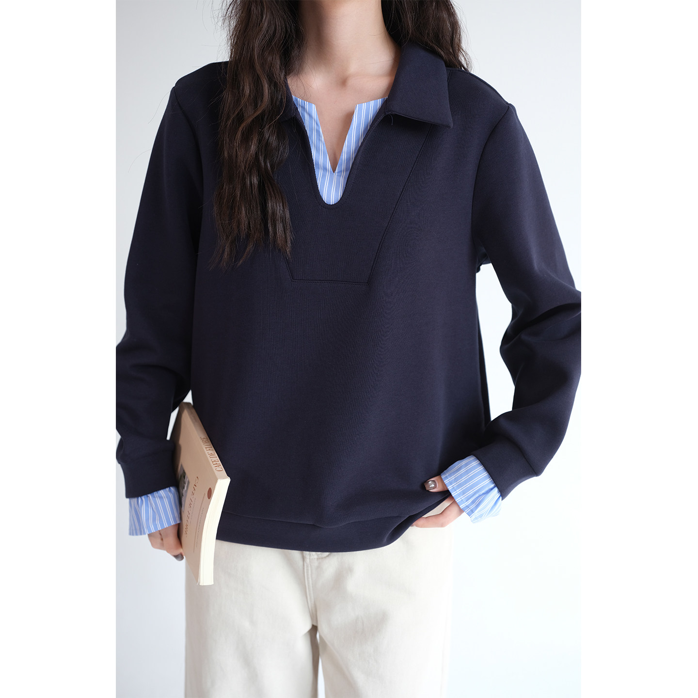 新款 女2026春装 蓝若水大码 胖MM宽松上衣 设计感V领假两件卫衣
