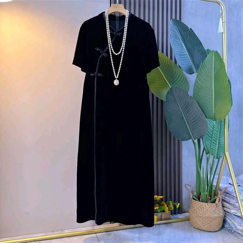 法式 女装 复古风气质洋气显瘦连衣裙 旗袍裙大码 加肥立领斜盘扣短袖