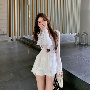 两件套装 雪纺衬衫 女v领吊带背心内搭 白色蕾丝花边喇叭袖 ByYou秋季