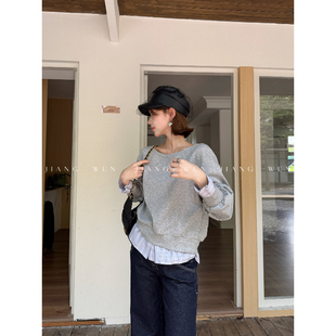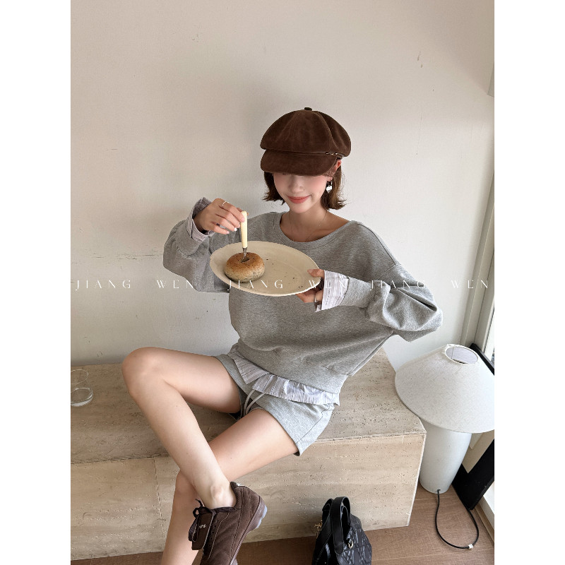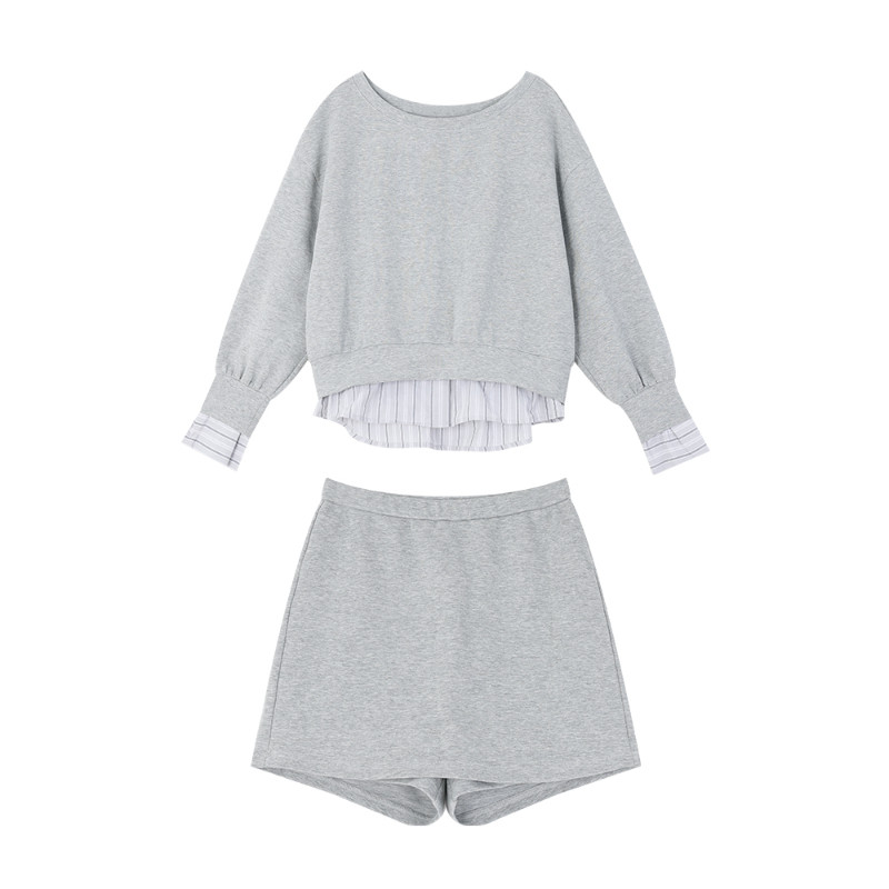 露肩两件套裙子休闲上衣斜肩拼接假两件 长袖 韩系灰色卫衣套装 裙裤