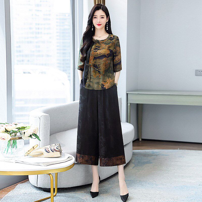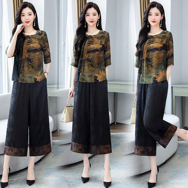 新款 阔腿裤 夏装 大码 年轻奶奶新中 复古秋季 中老年妈妈香云i纱套装
