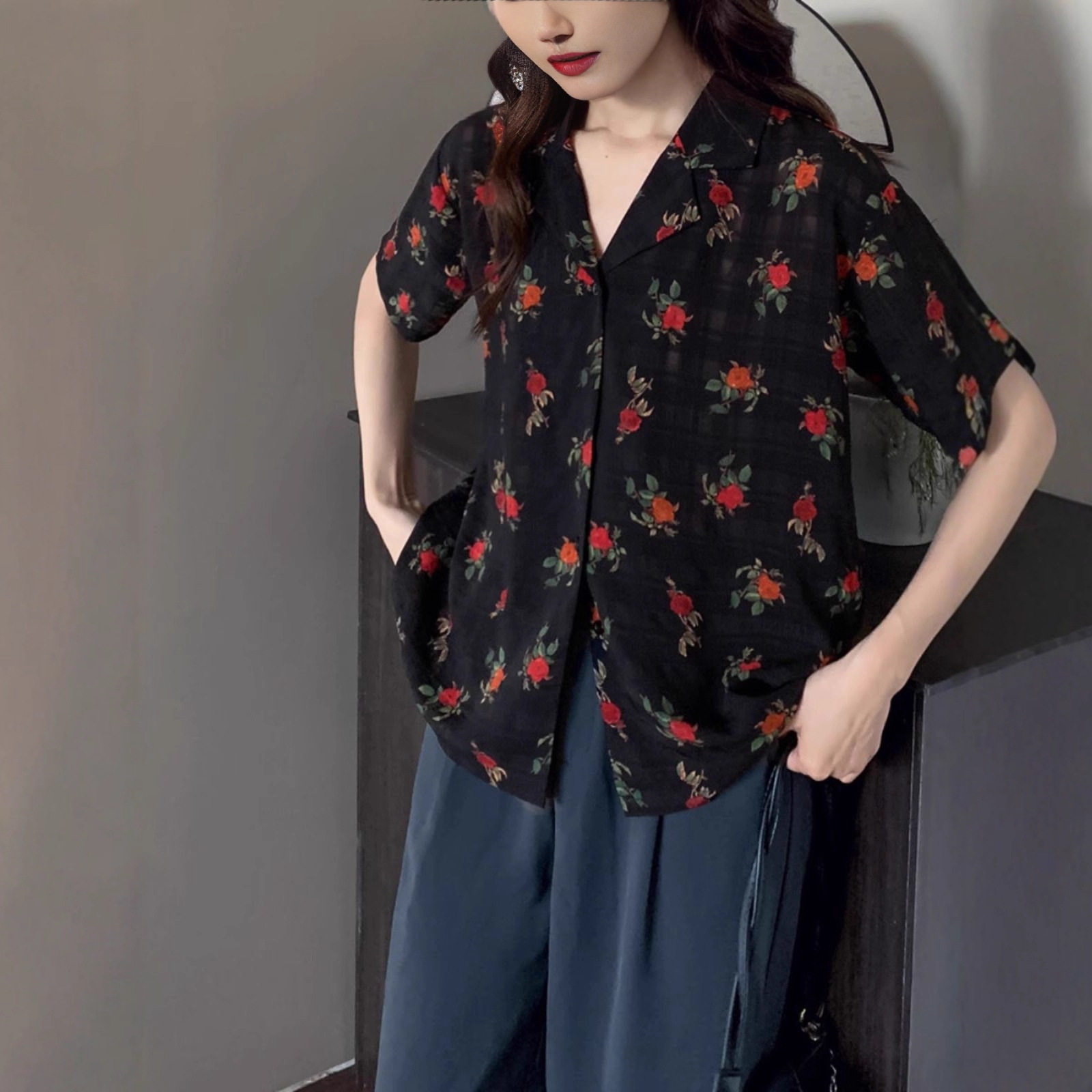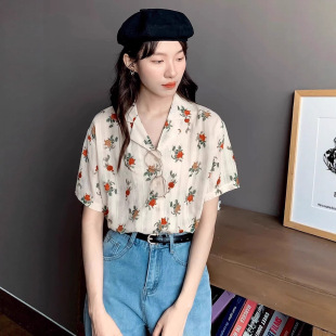 小个子西装 女夏季 领衬衣设计感小众 衬衫 复古玫瑰印花雪纺短袖