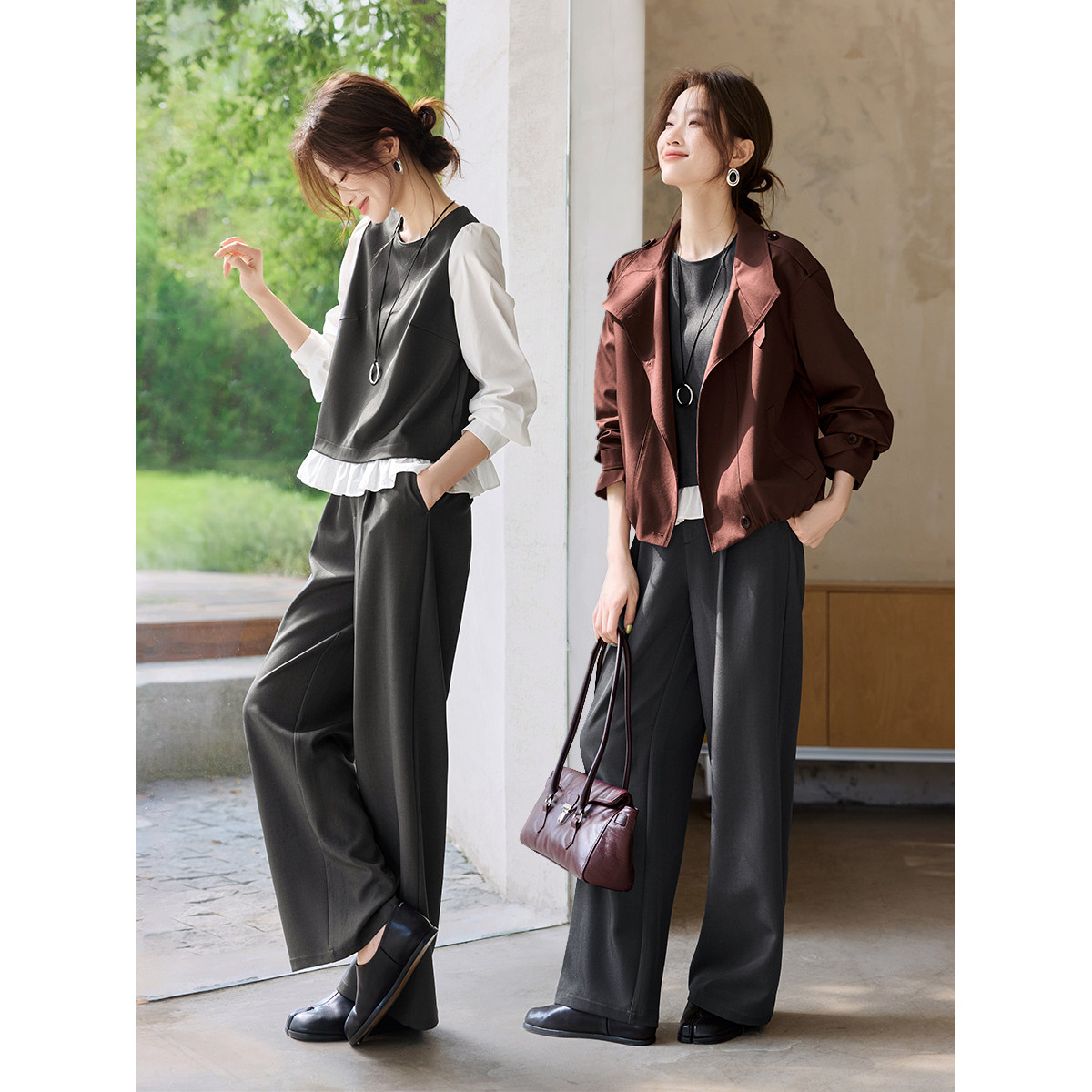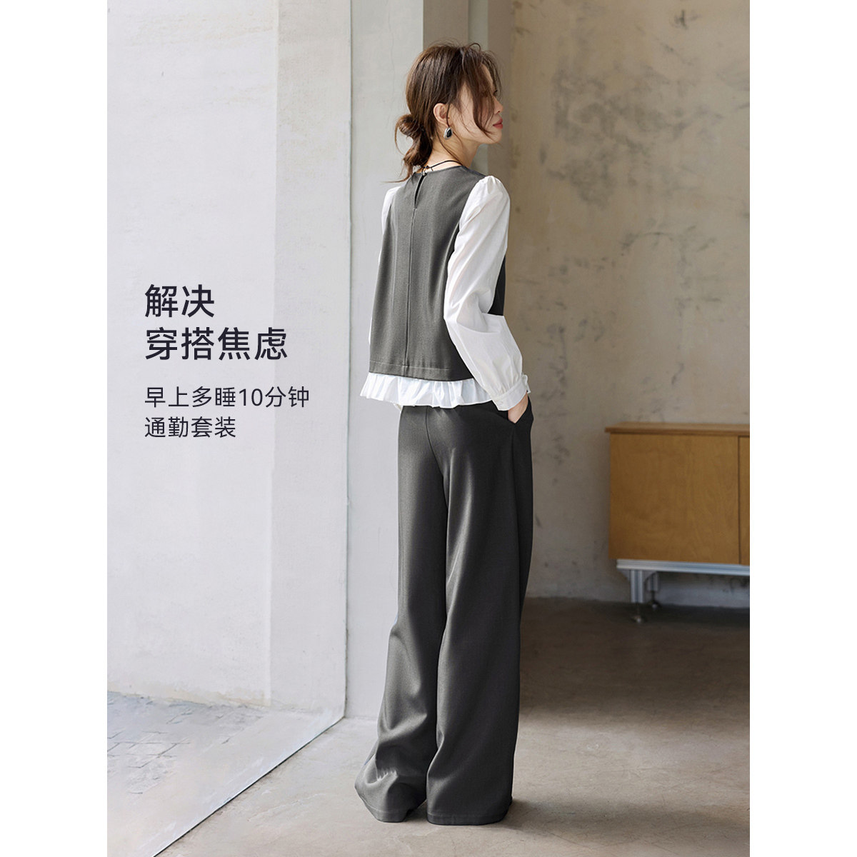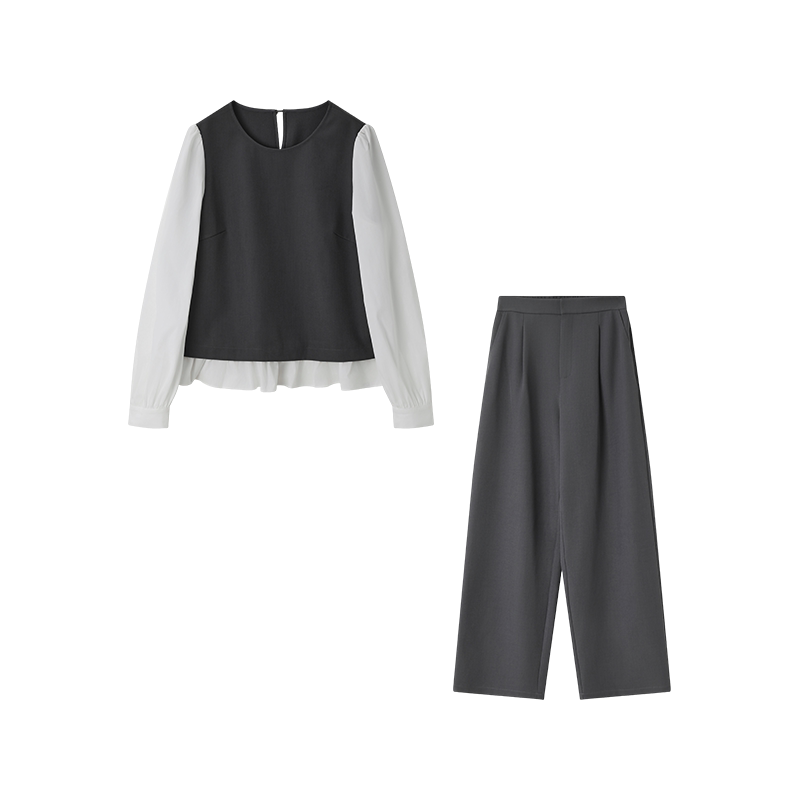 减龄套装 假两件下摆荷叶边阔腿裤 新款 沫晗依美通勤两件套2026春季