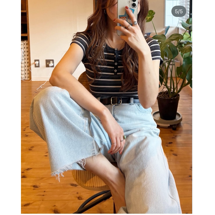 简约纽扣配色条纹百搭短袖 美式 T恤 2026春夏 纯正