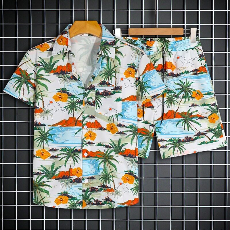 衬衣 沙滩套装 港风vintage花衬衫 男女复古夏威夷痞帅宽松情侣短裤