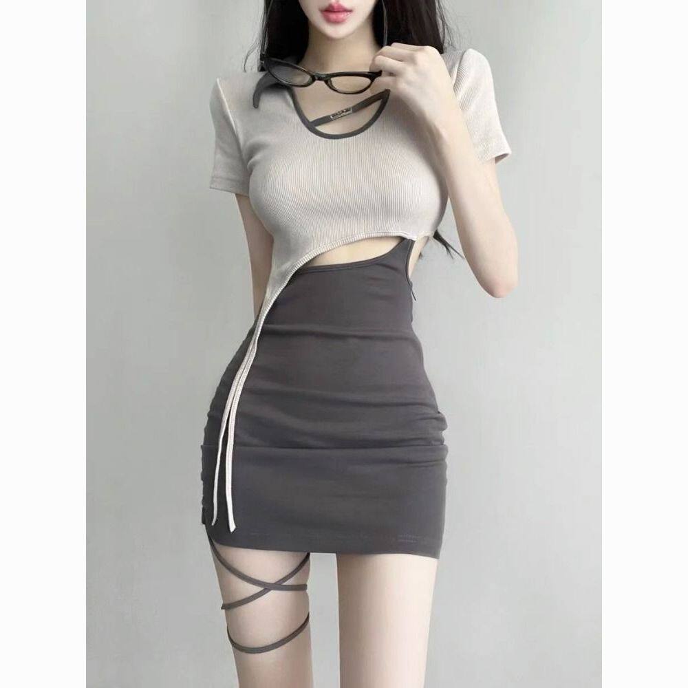 纯欲风镂空修身 显瘦连衣裙辣妹绑带包臀裙性感露腰不规则拼接短裙