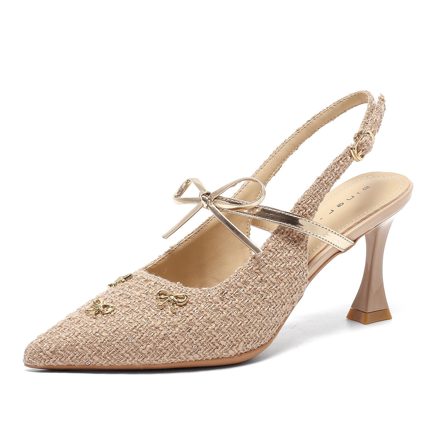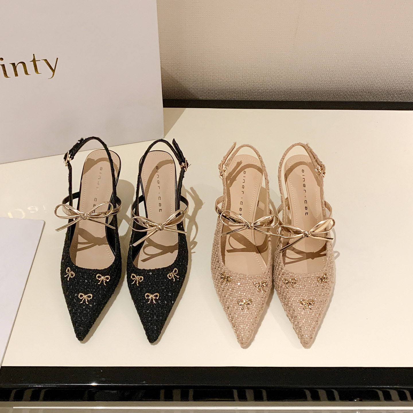 蝴蝶结编织面单鞋 7cm高跟鞋 法式 尖头后空包头凉鞋 女细跟2026新款