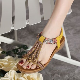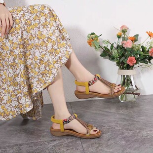 配裙 坡跟平底防滑旅游沙滩鞋 意尔康真皮民族风波西米亚凉鞋 女夏季