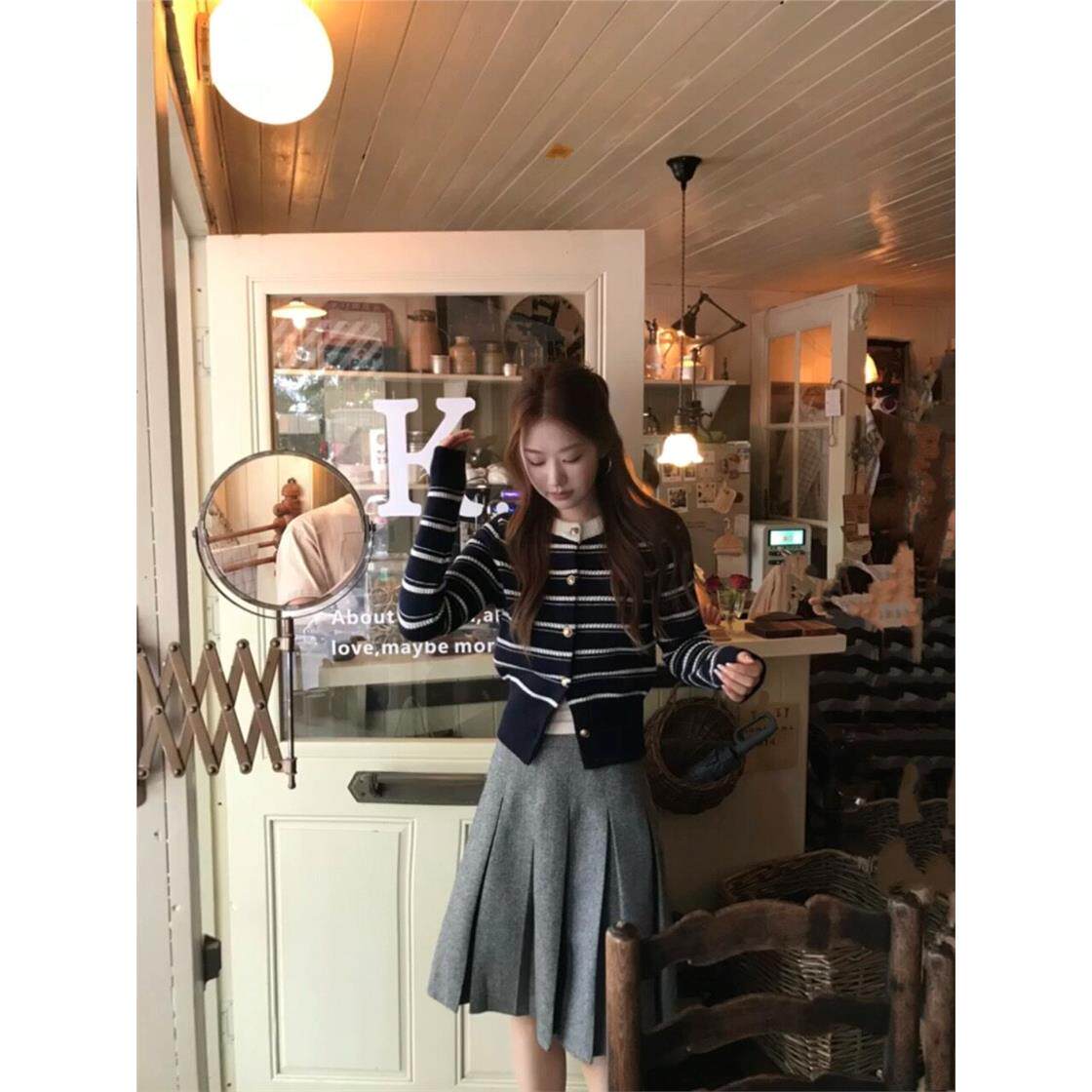 上衣 慵懒温柔风针织衫 韩系撞色条纹开衫 毛衣外套女秋冬小香风短款