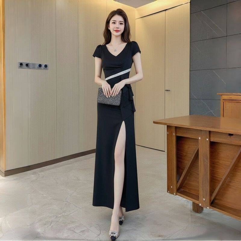 礼服连衣裙 显身材宴会通勤长款 优雅风白色V领短袖 裙镶钻腰饰修身