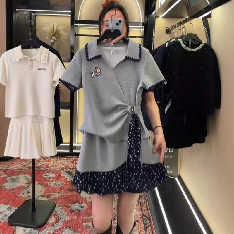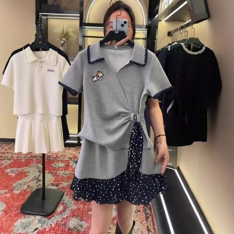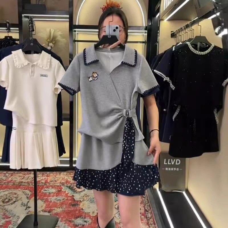 上衣半身裙气质套装 春季 两件套翻领波点不对称收腰短袖 时尚 女 韩版