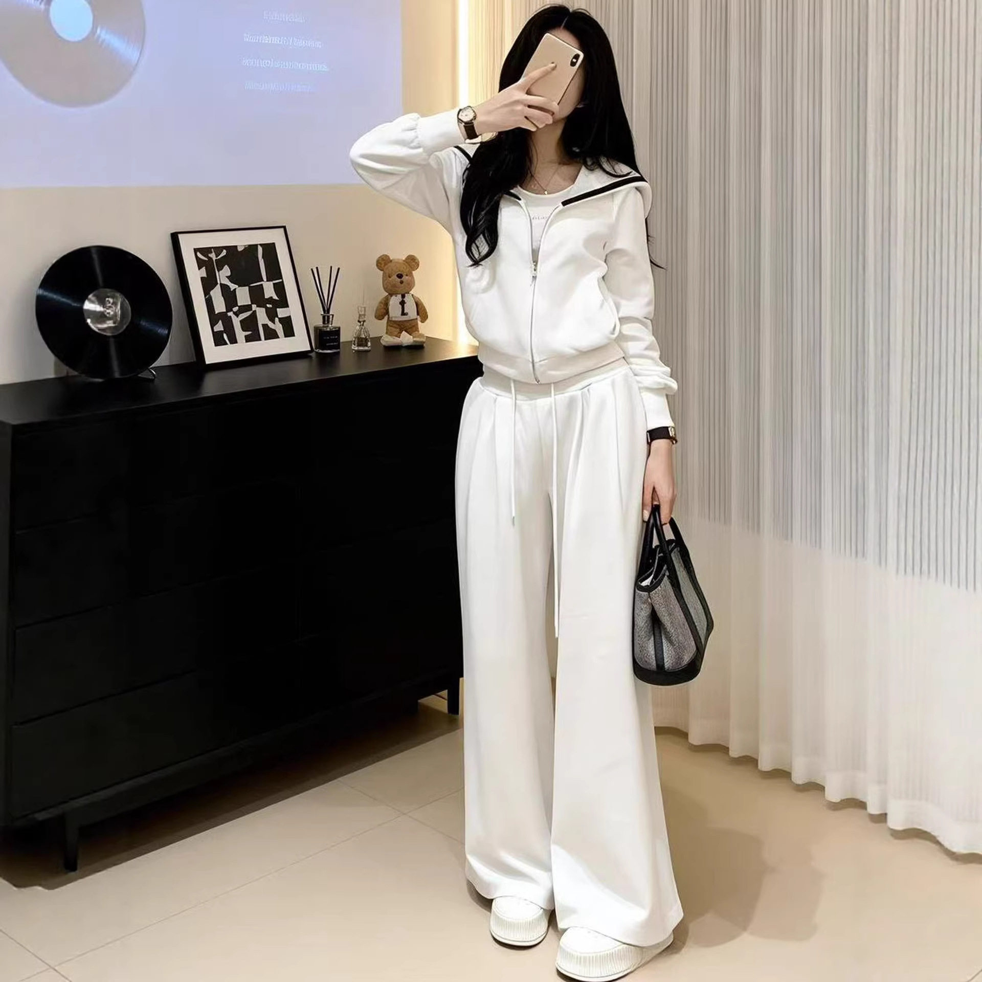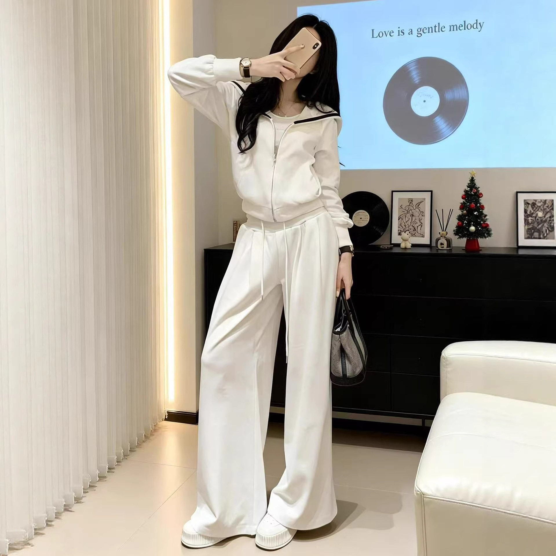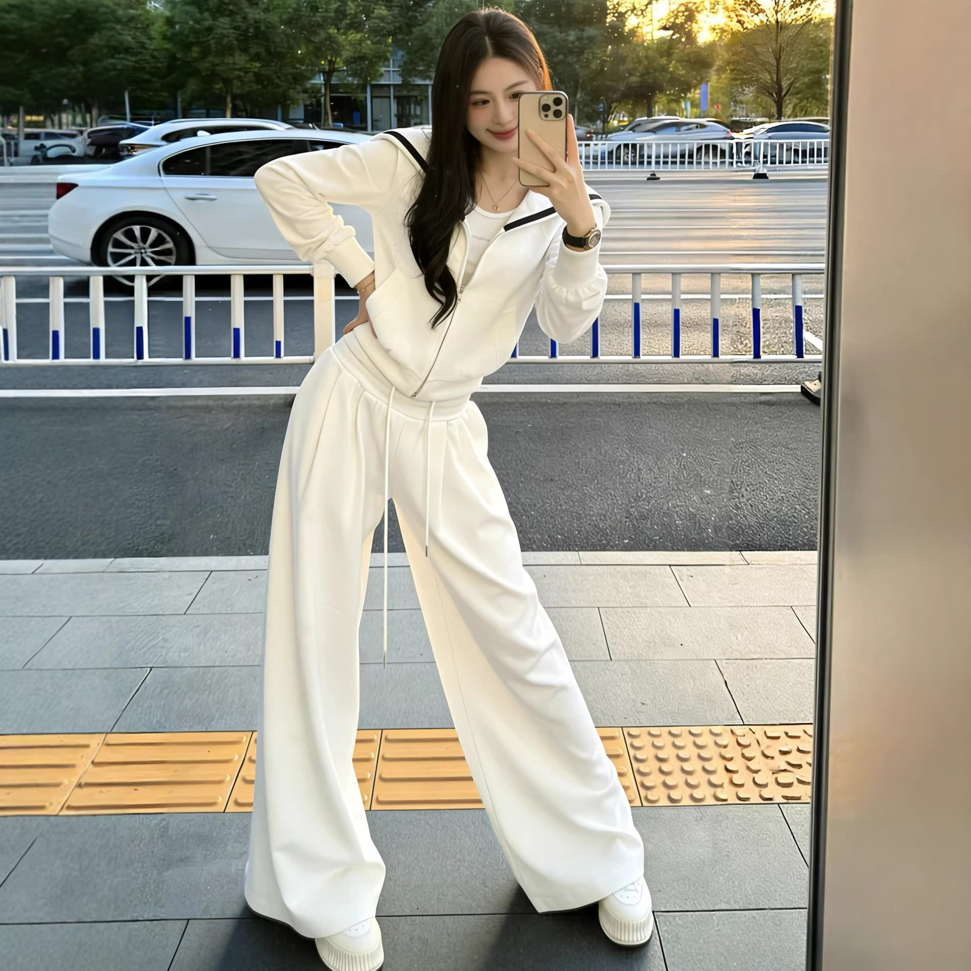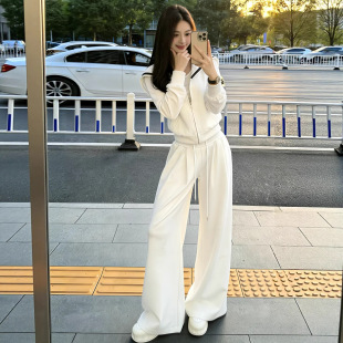 女 休闲两件套装 巨好看春装 一整套高级感显瘦小香风白色卫衣阔腿裤