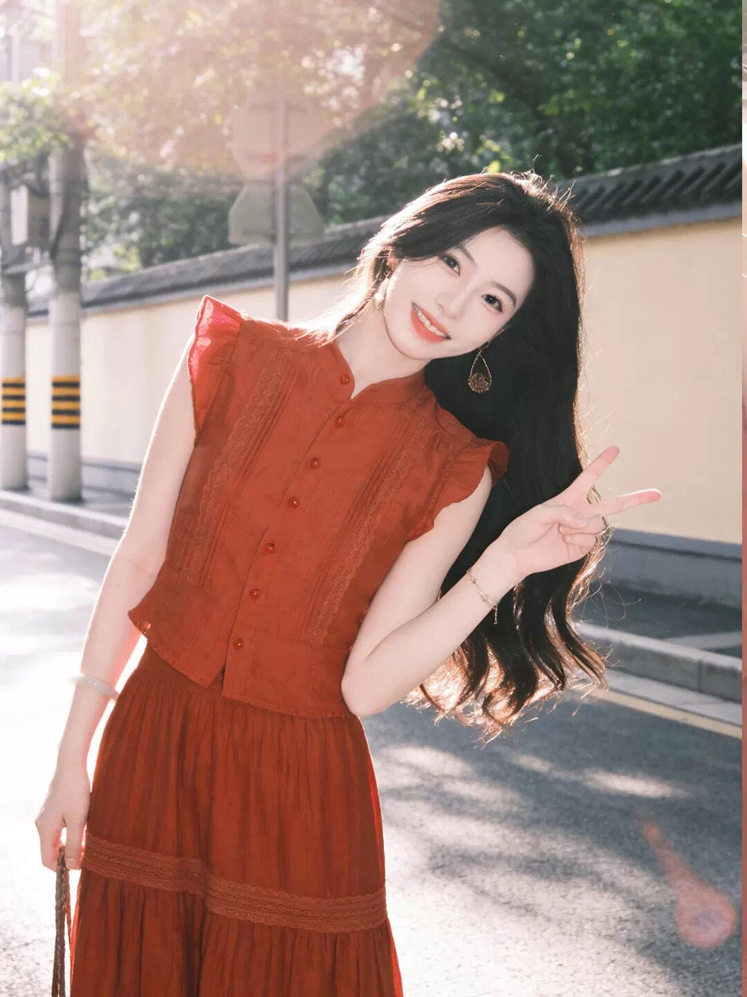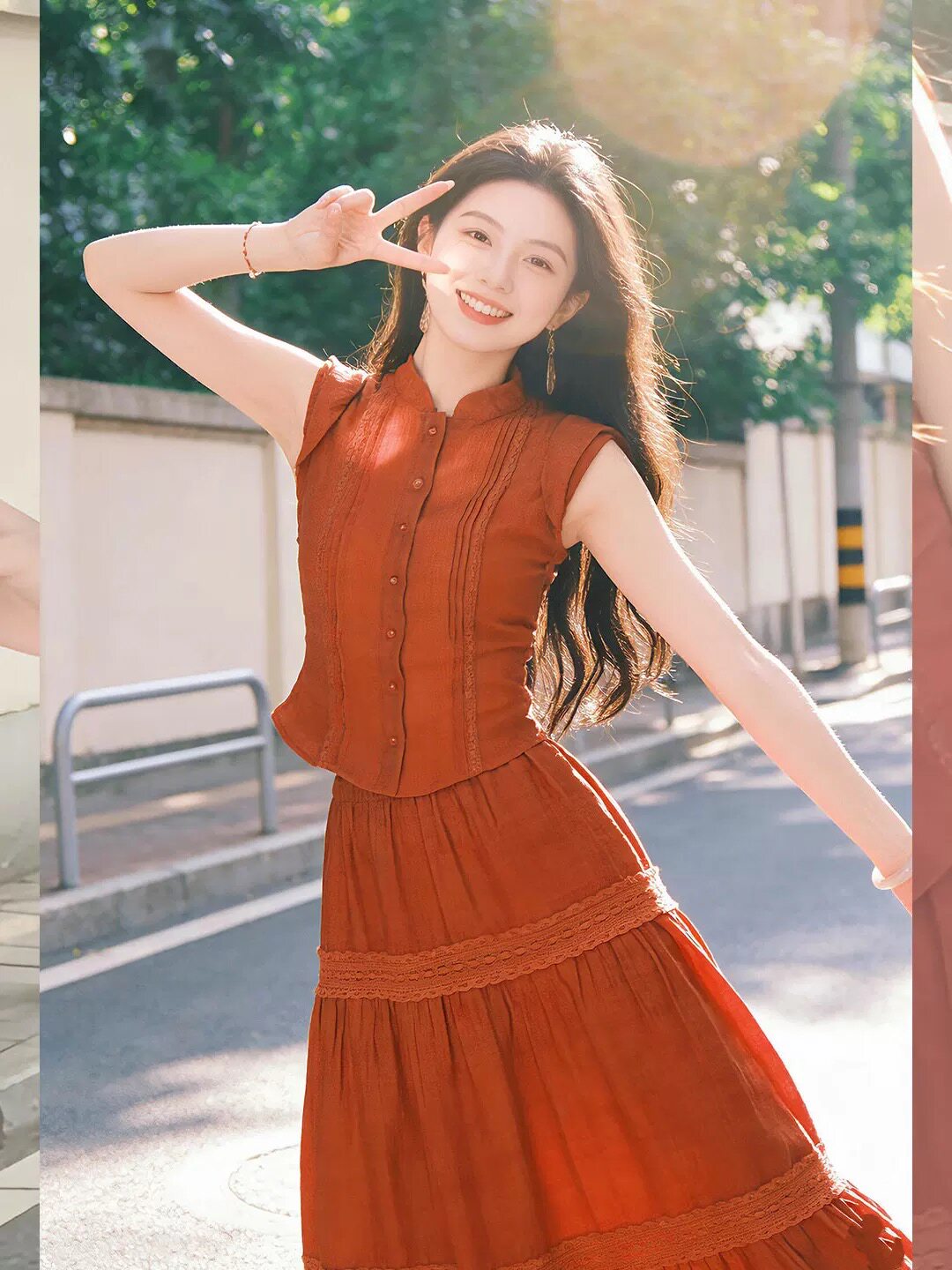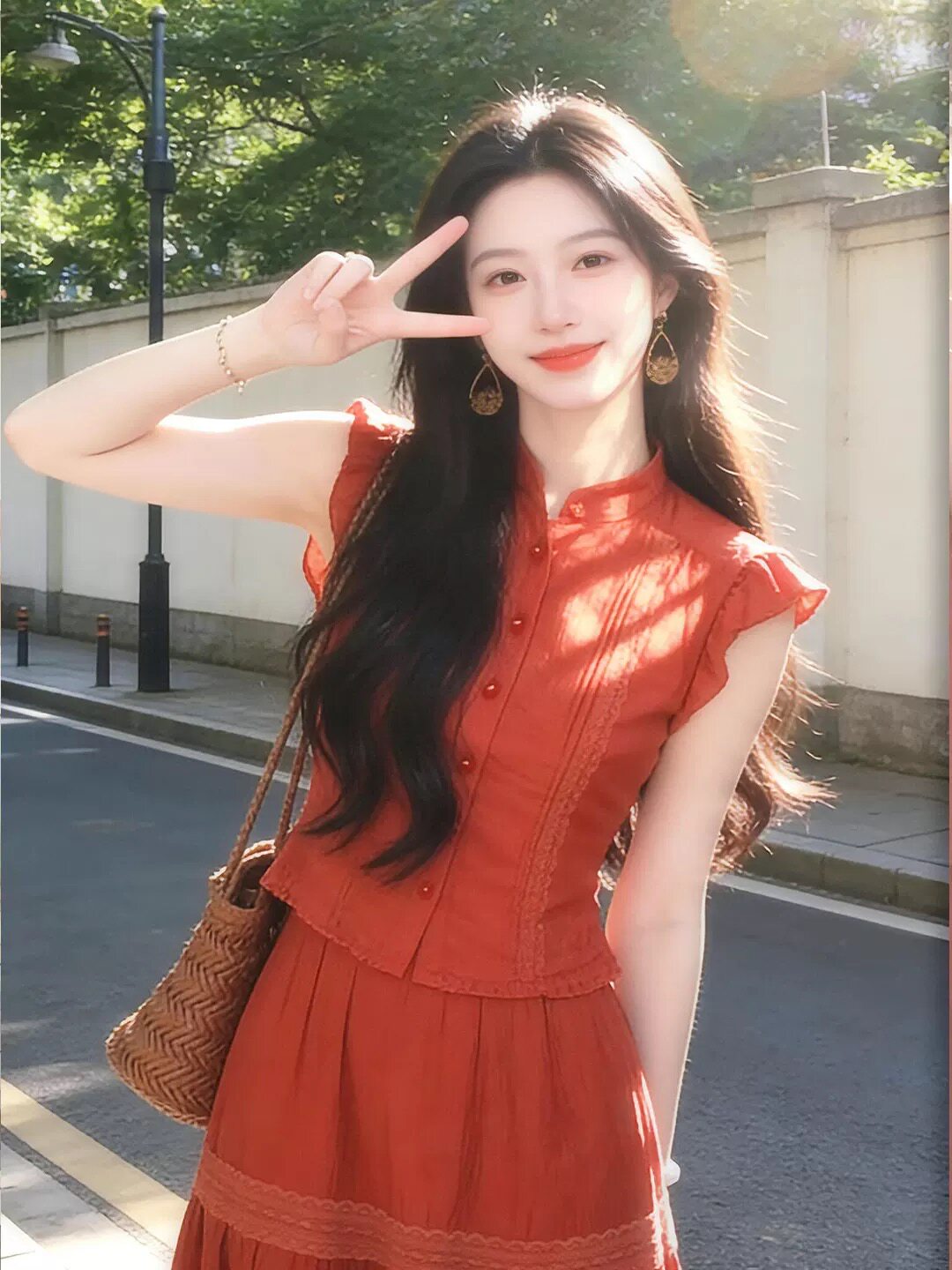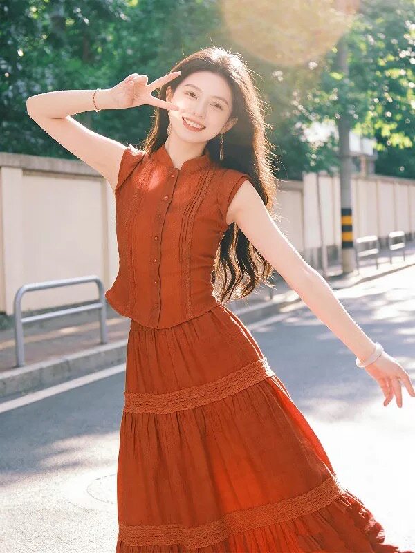 南法假日风红色无袖 明媚穿搭背心蕾丝拼接大摆裙两件套 上衣女夏季