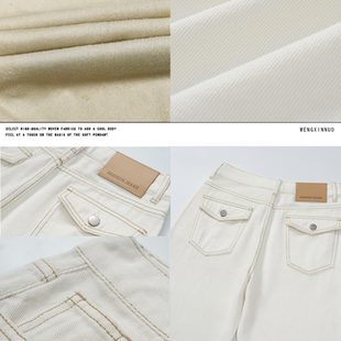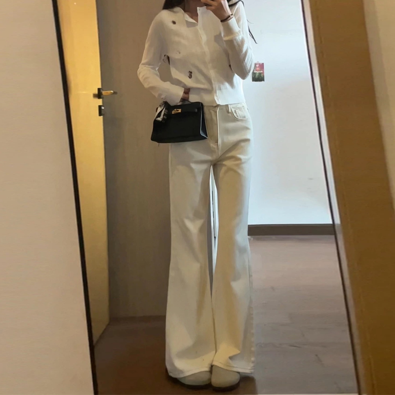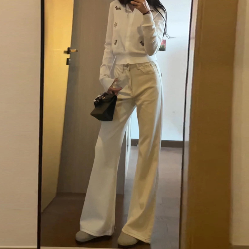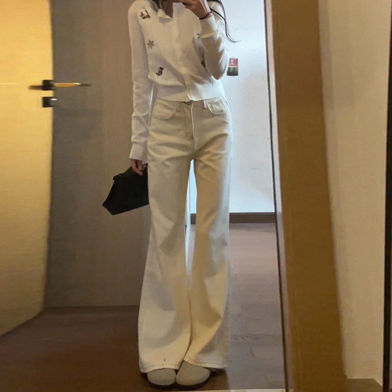 子 显瘦垂感不贴腿直筒喇叭裤 米白色加绒微喇牛仔裤 女2025秋冬新款
