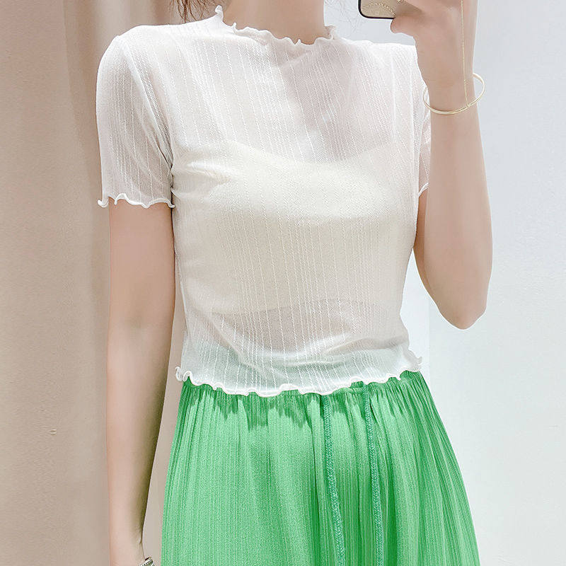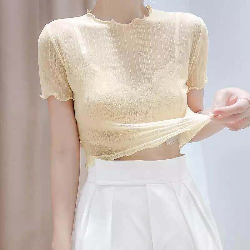 春夏网纱T恤女短袖 夏蕾丝上衣薄纱衣木耳边0322d 吊带裙内搭打底衫