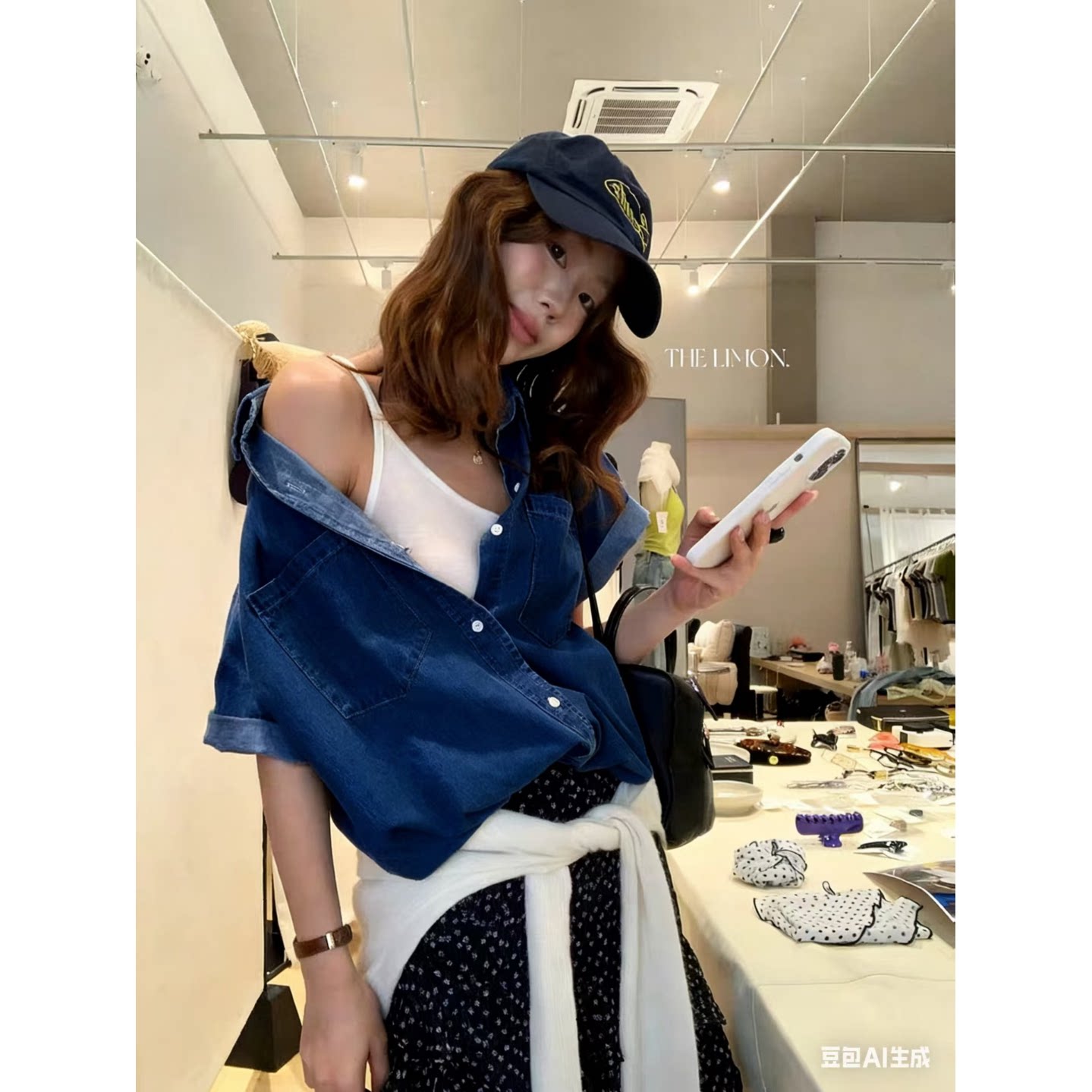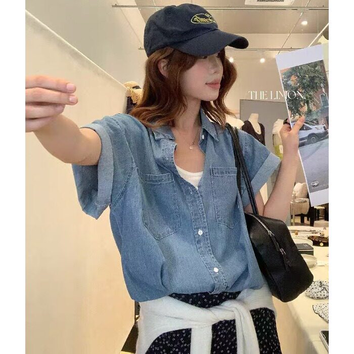 纯色百搭少女短袖 韩版 上衣开衫 牛仔衬衫 夏季 显瘦遮肉显白女装 新款