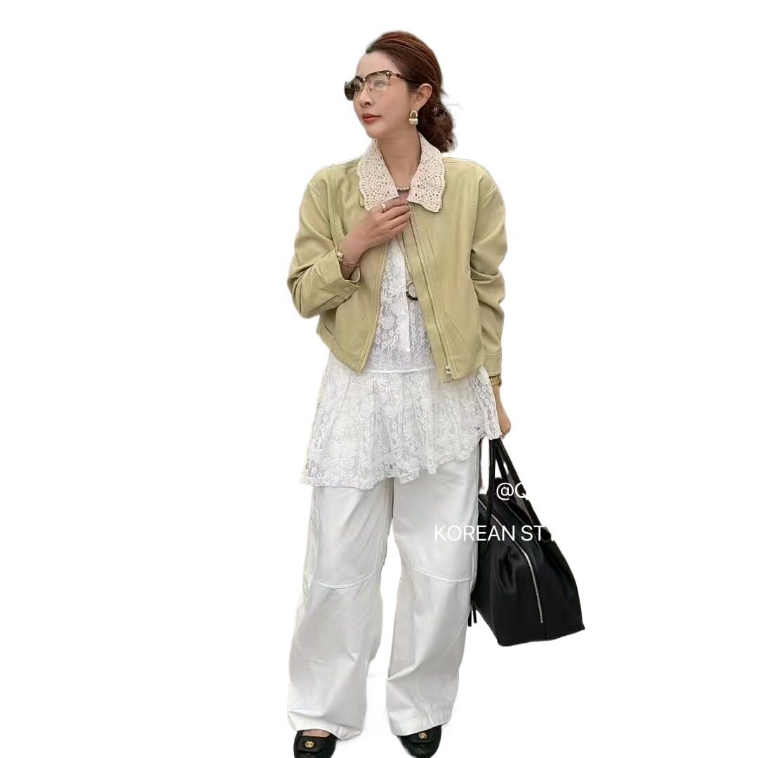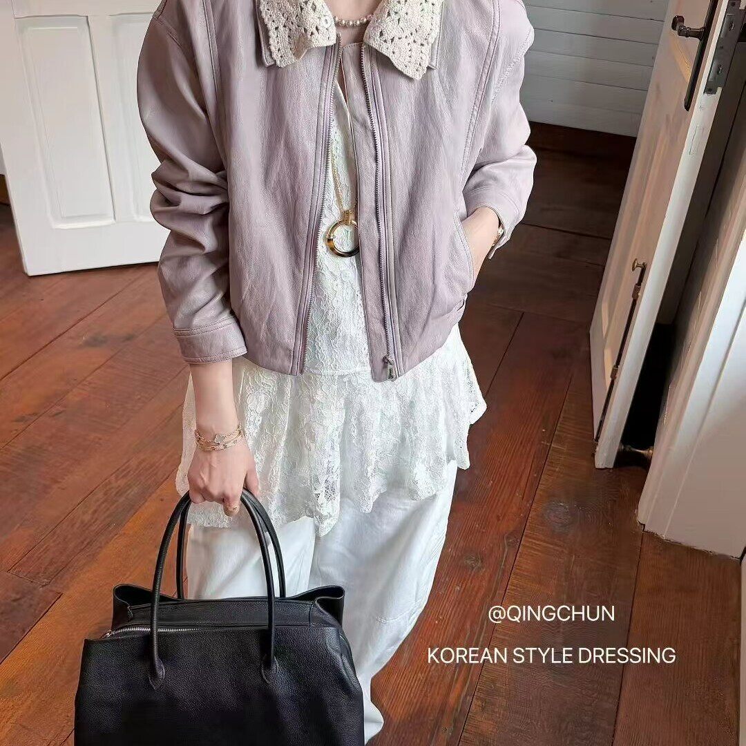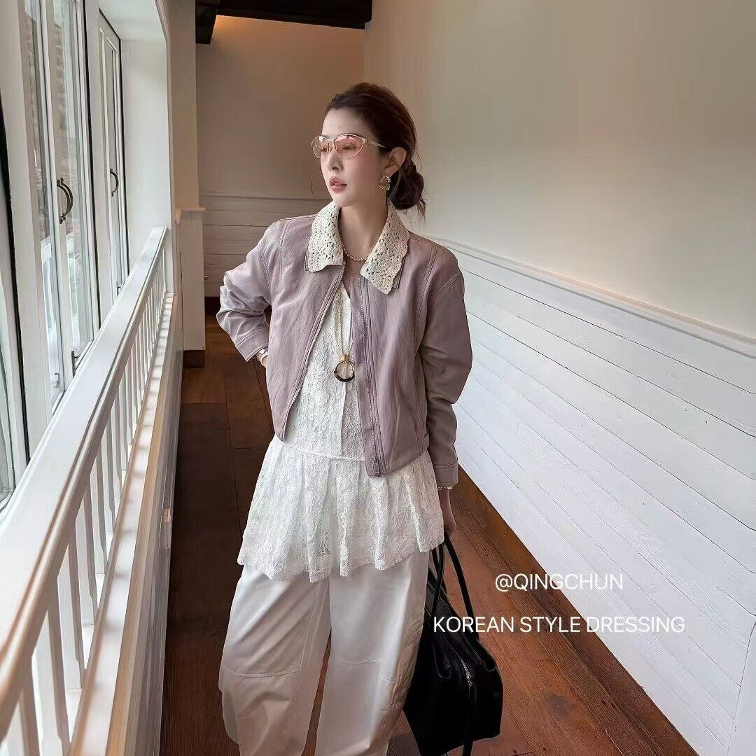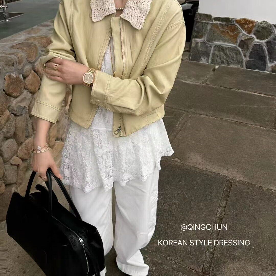 百搭显瘦夹克上衣潮 韩版 蕾丝拼接皮衣外套女欧洲站2026年春季 新款