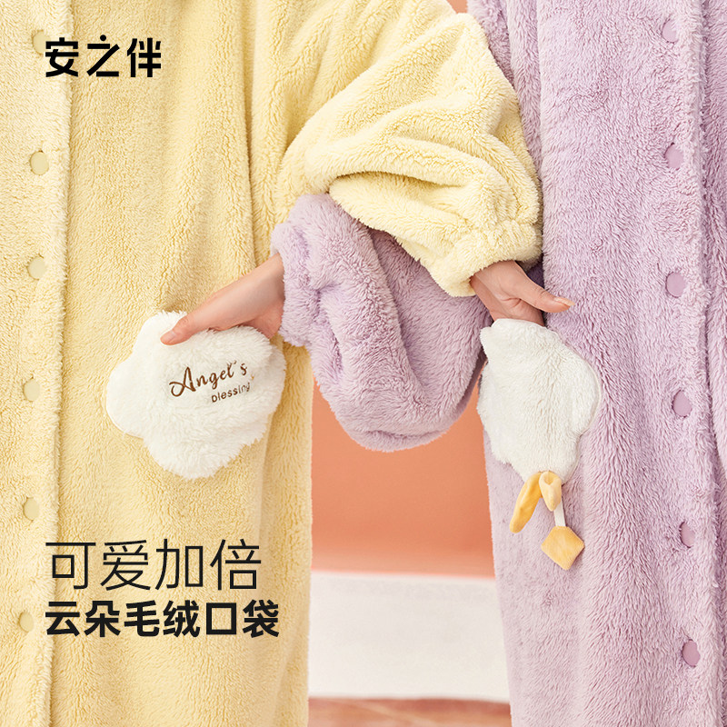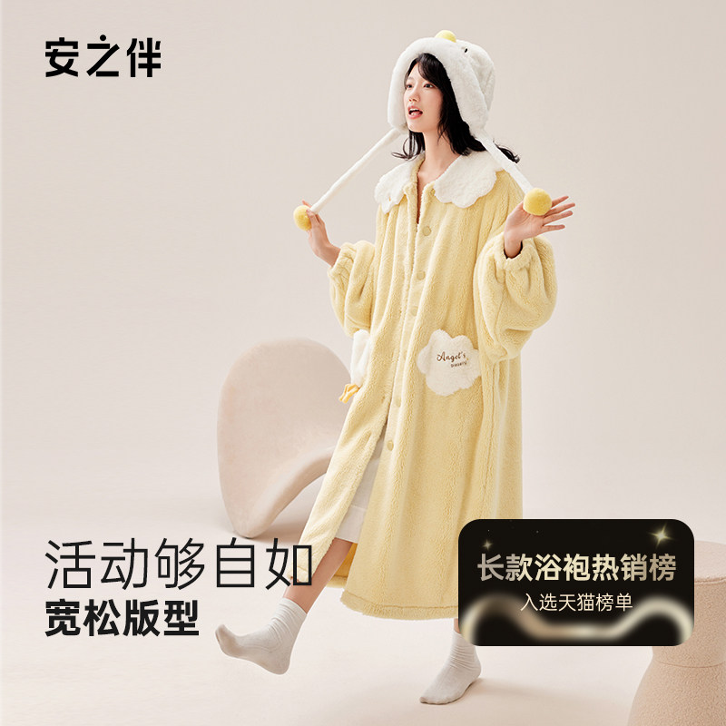 安之伴加厚珊瑚绒睡袍女秋冬甜美法兰绒晨袍中长版 睡衣浴袍家居服
