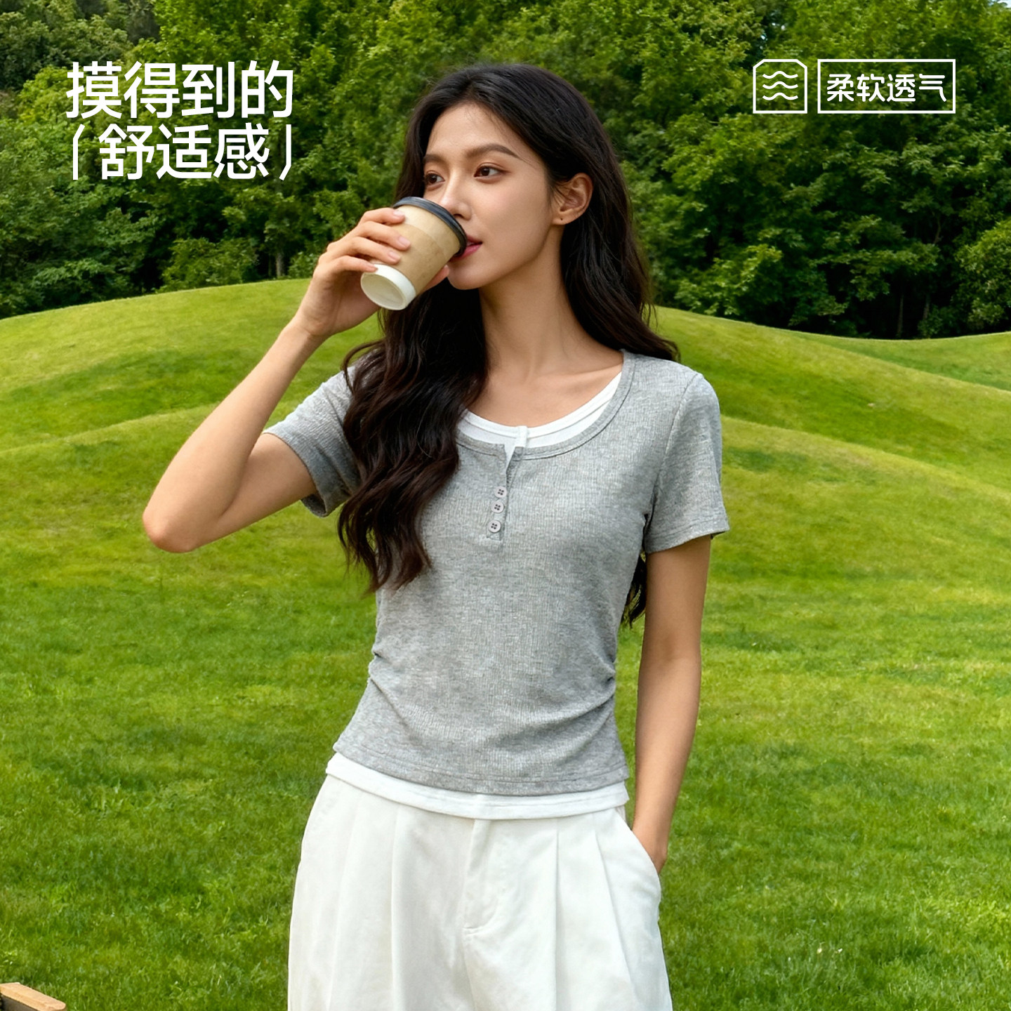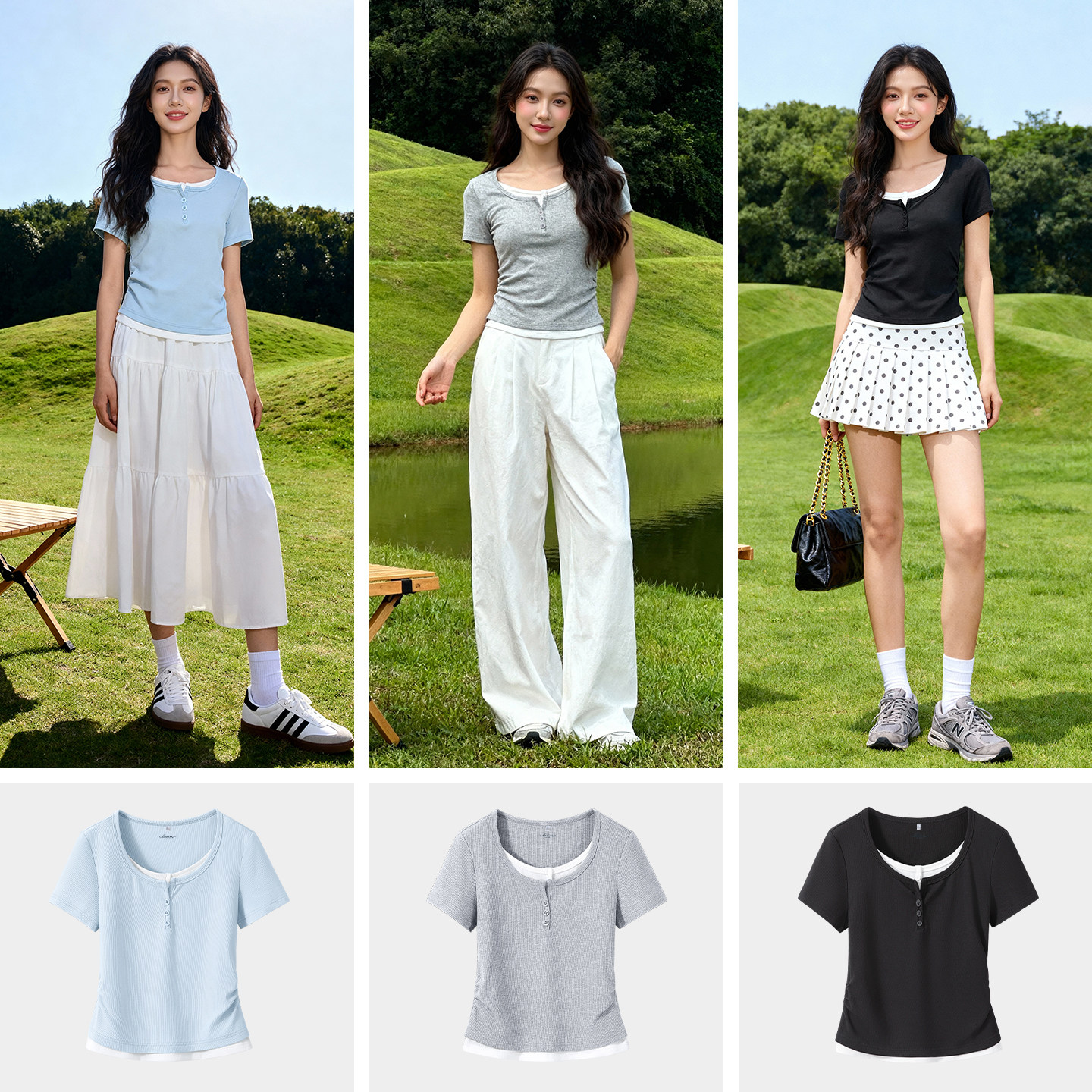 显瘦高级感短款 班尼路蓝色假两件短袖 修身 2026新款 上衣H t恤女夏季