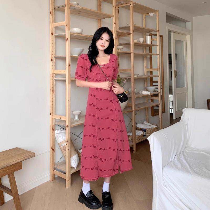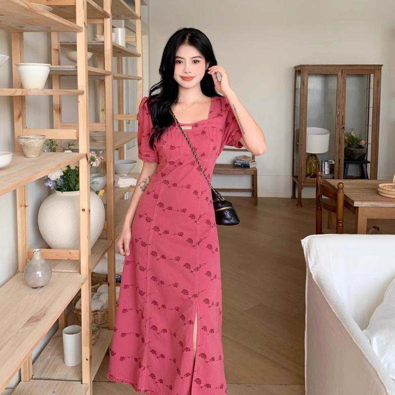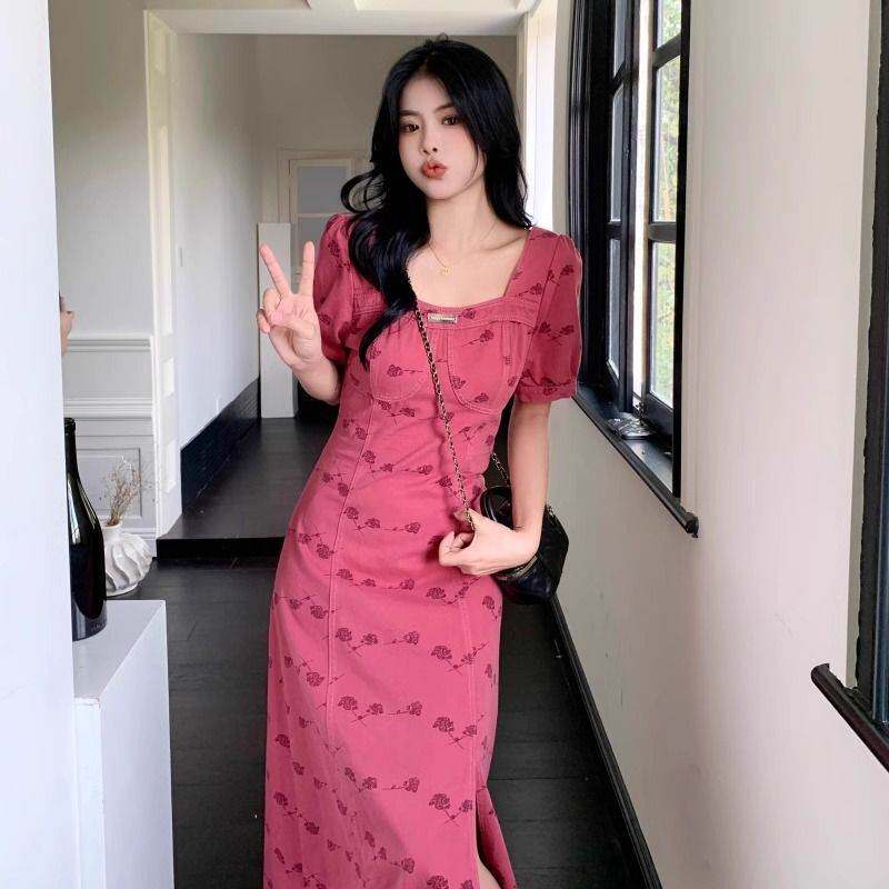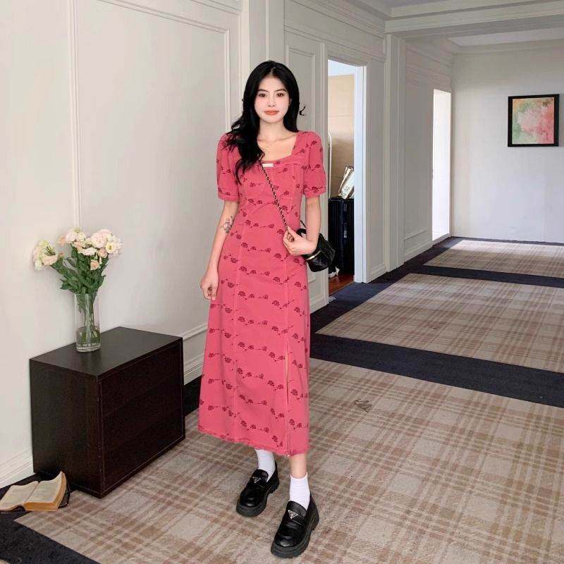 粉色温柔风连衣裙侧开叉胖显瘦闺蜜碎花裙子女夏装 新款 女装 大码